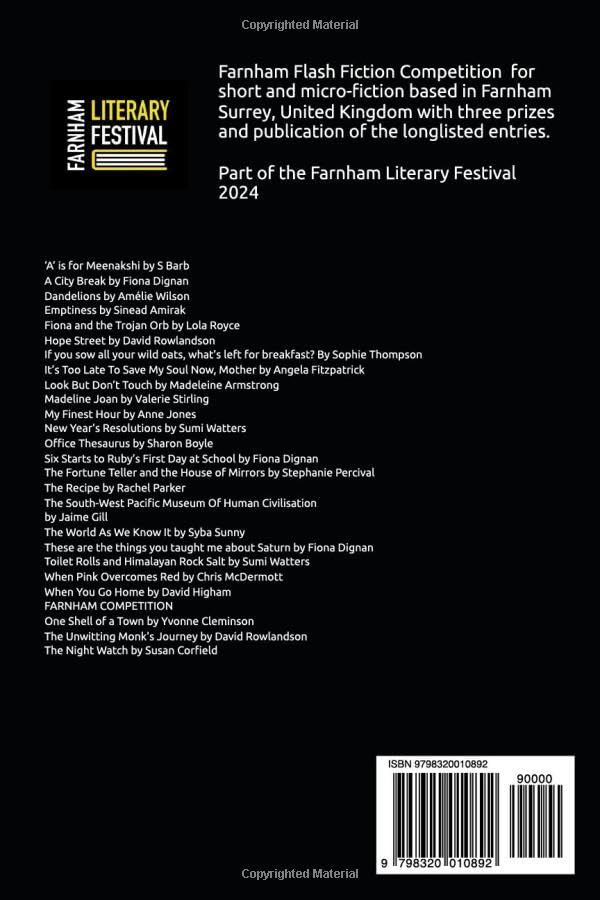 Do you enter Flash Fiction competitions? Would you like a peek at your competition? Then this collection of winning and longlisted flash fiction from the Farnham Flash Fiction competition is for you. Read and benchmark your work against your peers. Understand what makes a competition winning story. Be inspired, and take your writing to the next level. This is a collection of short fiction from the Farnham Flash Fiction competition 2024 Search for Farnham Flash Fiction competition for more information Now in its seventh year, this competition is part of the Farnham Literary Festival, which takes place in the regency town of Farnham at the start of the Surrey Hills in the UK, aka at the gateway to Jane Austen country. We look for entries up to 500 words and offer 3 prizes. The first prize is PS75 for the overall winner and PS25 for the runner-up , then a further PS25 for the best story featuring Farnham Town.