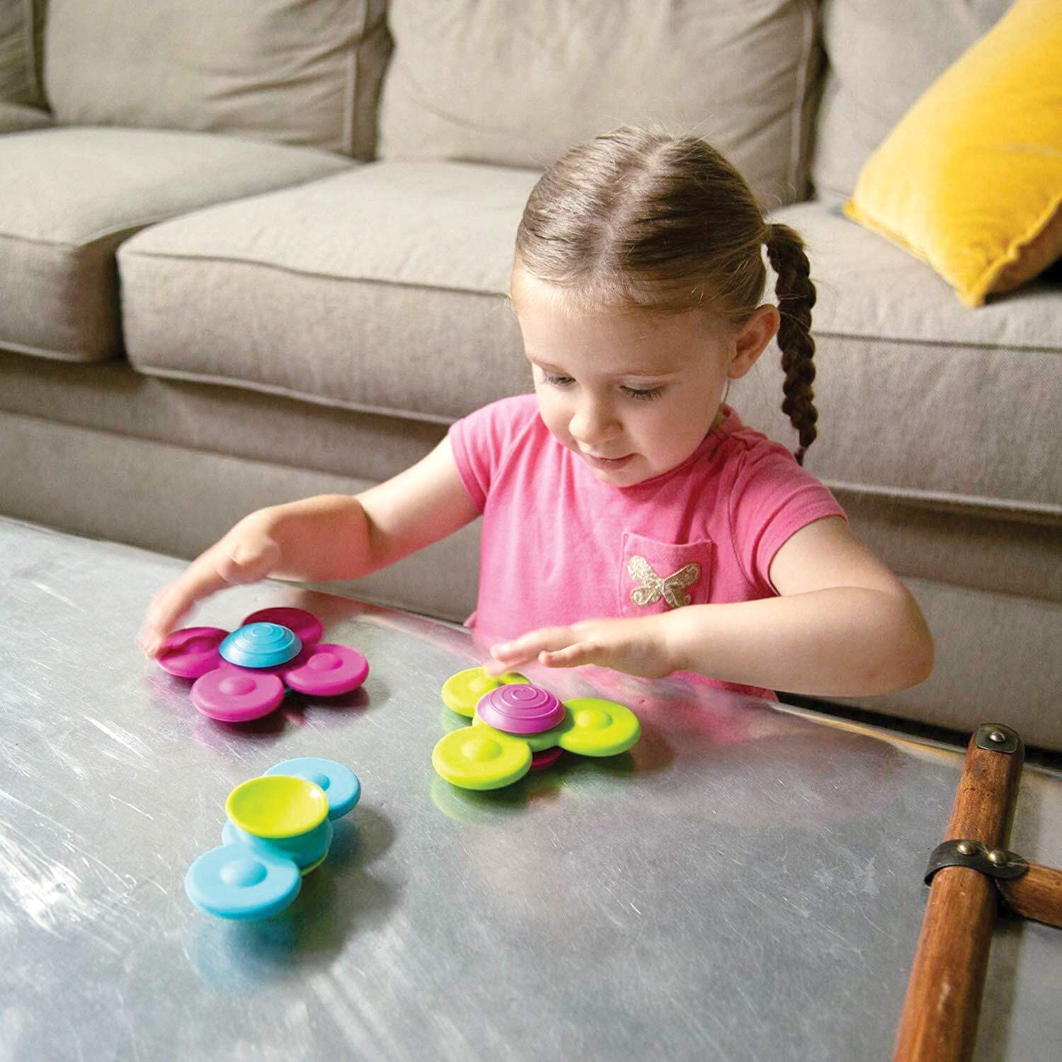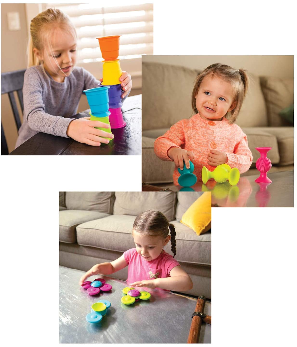FUN LITTLE SUCKERS, STACKERS, AND SPINNERS! – Squigz are innovative suction toys that stick to each other and most flat surfaces, then pull apart with a POP. A variety of quirky shapes, textures, and bold colors make up this 12-piece baby fidget toy set.