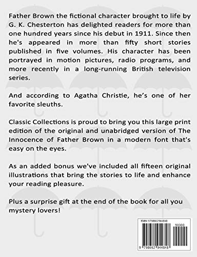 Father Brown Large Print Mysteries If you’re looking for Father Brown books by G. K. Chesterton , you’ve come to right place. Father Brown the fictional character brought to life by G. K. Chesterton has delighted readers for more than one hundred years since his debut in 1911 Since then he’s appeared in more than fifty short stories published in five volumes. His character has been portrayed in motion pictures, radio programs, and more recently in a long-running British television series. Classic Collections is proud to bring you The Innocence of Father Brown large print edition in the original and unabridged version in a modern font that’s easy on the eyes. As an added bonus, we’ve included fifteen beautifully illustrated had drawn pictures that bring these Father Brown mysteries to life and enhance your reading pleasure. Plus a surprise gift at the end of the book for all you mystery lovers! This is the first Father Brown paperback in our large print series. To get the complete stories check out The Wisdom of Father Brown as well.