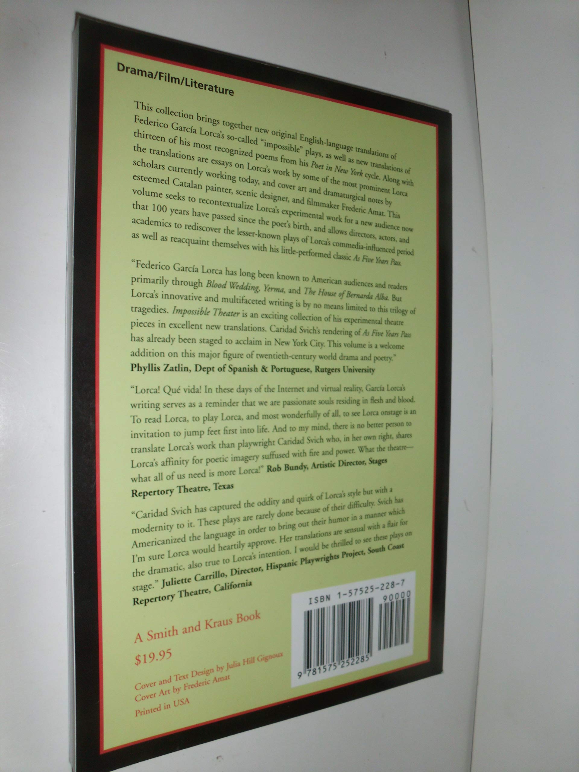 This collection brings together new original English-language translations of frederico Garcia Lorca’s so-called “impossible” plays, as well as new translations of thirteen of his most recognized poems from his Poet in new York cycle. Along with translations are essays on Lorca’s work by some of his most prominent Lorca scholars currently working today, and cover art and dramaturgical notes by esteemed Catalan painter, scenic designer, and filmmaker Frederic Amat. This volume seeks to recontextualize Lorca’s experimental work for a new audience now that 100 years have passed since the poet’s birth, and allows directors, actors, and academics to rediscover the lesser-known plays of Lorca’s commedia-influenced period as as reaquaint themselves with his little-performed classic As Five Years Pass.