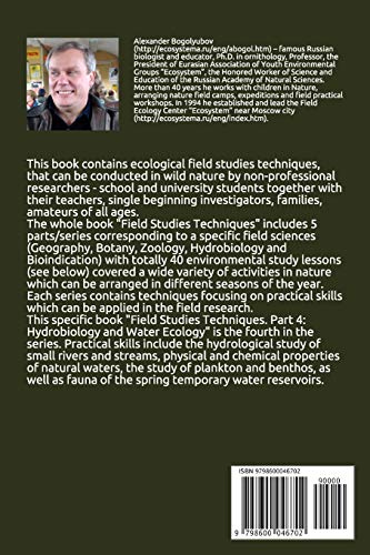 This book contains ecological field studies techniques, that can be conducted in wild nature by non-professional researchers – school and university students together with their teachers, single beginning investigators, families, amateurs of all ages. The whole book “Field Studies Techniques” includes 5 parts/series corresponding to a specific field sciences (Geography, Botany, Zoology, Hydrobiology and Bioindication) with totally 40 environmental study lessons (see below) covered a wide variety of activities in nature which can be arranged in different seasons of the year. Each series contains techniques focusing on practical skills which can be applied in the field research. This book promotes a wide variety of outcomes which correspond to established educational standards in many countries. The ecological field study activities address content standards in the areas of earth science, life science, biology and ecology. Intellectual skill development includes questioning, data collection, analysis and drawing conclusions.This book is addressed to the middle and secondary level science teachers and students, and for all those who would like to investigate local wild nature, to share ecological and cultural information and work together to help create a better environment. This specific book “Field Studies Techniques. Part 4: Hydrobiology and Water Ecology” is the fourth in the series. Practical skills include the hydrological study of small rivers and streams, physical and chemical properties of natural waters, the study of plankton and benthos, as well as fauna of the spring temporary water reservoirs. The techniques described in this book, were written by Alexander Bogolyubov (1996-2002), translated into English by Tatiana Tatarinova (2002) and edited by Michael Brody (2003). The list of all field study lessons: I. GEOGRAPHY: Orienteering in the forest Eye Survey of the Field Study Site Mapping Forest Vegetation Geological Exposure Description Minerals and Rocks in Your Area Profile of a River Valley Slope Soil Description Integrated Study on Landscape Profile Description of Small Rivers and Streams Study of Snow Cover Making a Campfire II. BOTANY: Species Composition and Number of Fungi Making a Herbarium Plants in Your Local Environment Vertical Structure of a Forest Green Plants Under Snow Ecology of Early Flowering Plants Phenology of Plant Florescence Assessment of Ecological Features of Meadows Vital State of Coniferous Underbrush Growth Dynamics of Trees Based on Annual Rings Vital State of a Forest Based on Pine-tree Analysis Environmental State of the Forest Based on Leaves’ Asymmetry III. ZOOLOGY: Forest Invertebrates 1: Forest Litter and Wood Forest Invertebrates 2: Grass, Tree Crowns and Air Water Invertebrates in a Local River Species Composition and Abundance of Amphibians Making Feeders and Nesting Boxes Species Composition and Census of Birds Studies of Bird Populations by Different Methods Day Activity of Singing Birds Birds’ Nesting Life Observation of a Chickadee Flock’s Territorial Behavior Winter Mammals Route Census by Footprints Mammal Ecology According to Their Tracks IV. HYDROBIOLOGY: Description of Small Rivers and Streams Physical and Chemical Properties of Natural Waters Water Invertebrates in a Local River Study of Plankton Fauna of Spring Temporary Water Bodies Species Composition and Abundance of Amphibians V. BIOINDICATION: Air Pollution by Lichen Indication Method Vital State of a Forest Based on Pine-tree Analysis Ecological Features of Meadows on the Base of Vegetation Cover Environmental State of the Forest Based on Leaves’ Asymmetry Vital State of Coniferous Underbrush Complex Environmental Assessment of Human Impact on an Area Water Invertebrates and Assessment of River Environmental State