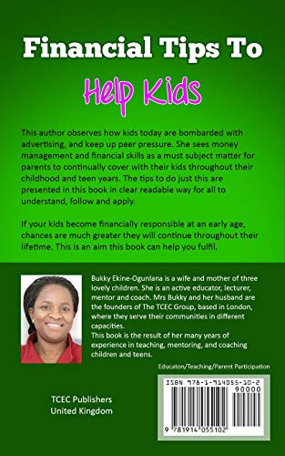 “You’ve got to tell your money what to do or it will leave.” (Dave Ramsey) In Financial Tips to Help Kids, author Bukky Ekine-Ogunlana draws on over a decade helping children and their parents and her experience teaching her own three children about money management to offer valuable kids’ money advice that will help them to learn the value of saving for college, budgeting for “wants” like toys and cell phone service, and building for financial freedom in the future. In this helpful kids’ money guide, grade school- and middle school-aged children learn life-changing advice on money-saving tips and kids’ investing tactics: How to start a successful child savings plan and start saving for future goals like college, their first car, and other large purchases Teaching children how ATMs and credit cards work and the costs of using them Proven methods for building kids spending plans that will work How to talk to kids about adult issues like debt and monthly payments How to say “no” when your child asks for money or unnecessary wants Kids and money for any age range – from early elementary school through middle school Teaching children the value of work and the reward of receiving payment for completed tasks and jobs Page up and order now.