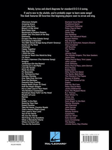 Play 50 Must-Know Songs with Confidence on Ukulele. * First 50 Songs You Should Play on Ukulele is the perfect starting point for beginners ready to move from chords to full songs. This book includes melody lines, lyrics, and chord diagramsmaking it easy for learners to follow and play along. * * Easy Arrangements of Classic and Contemporary Hits. * This 136-page ukulele songbook features a diverse mix of pop, folk, rock, and traditional songs. From Hallelujah to Hey, Soul Sister, Imagine to Take Me Home, Country Roads, each piece is arranged for accessibility and enjoyment. * * Build Skills While Playing Recognizable Favorites. * Whether you’re teaching yourself or learning in a classroom, the clear notation and chord guidance help build a solid musical foundation. This book is ideal for strumming practice, sing-alongs, or solo performance. * * A Thoughtful Gift for Musicians and a Useful Music Teacher Resource. * Great for adult learners or younger students starting their ukulele journey, this collection makes a wonderful gift for ukulele players and a practical tool for teachers guiding beginners through familiar tunes. * * Songs Included: * Afternoon Delight* Amazing Grace* Auld Lang Syne* Blowin’ In The Wind* Both Sides Now* Edelweiss* Hallelujah* Hey, Soul Sister* I Walk The Line* I’m Yours* Imagine* Mack The Knife* Over The Rainbow* Peaceful Easy Feeling* Puff The Magic Dragon* Rainbow Connection* Riptide* Singin’ In The Rain* Take Me Home, Country Roads* This Land Is Your Land* You Are My Sunshine* and many more.