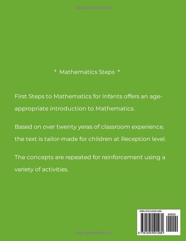 First Steps to Mathematics for Infants is a three-part book which introduces the young learner to Mathematics. The concepts are presented in an easy and interesting manner with a variety of activities for reinforcement. The first part introduces concepts like left right and middle, same and different, bigger and smaller, patterns, light and heavy, tall, short and long, and holds more and holds less. The second part focuses on numbers zero to ten. The activities include tracing and writing the numbers, drawing objects for the numbers, circling and completing sets, and counting and matching to the number.The third part presents concepts like shapes, one to one correspondence, equals, more than and less than, bigger and smaller number, missing numbers in series 0-10, number names zero to ten, ordinals, whole and fractions, pictographs, classifying, and adding and taking away.Although designed for the 4-6 age group, it may be helpful to older children who have not mastered the concepts.