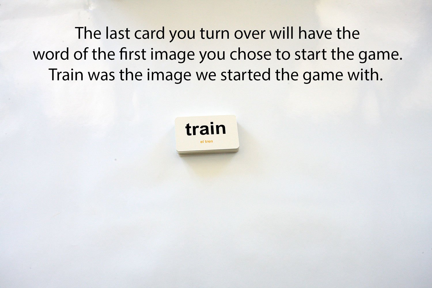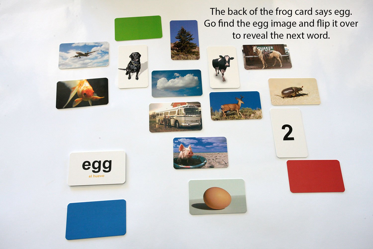 Place all 20 cards on a table with the image side facing UP. Pick up any card and turn it over. Let’s say that you chose the image of the cow. Flip it over to reveal the word on the back. The back of the cow image says….GREEN. Now go find the color green. GREAT you found it…. Flip it over to reveal the word on the back. The back of the green card says…. tree. Go look for the tree image. Continue the process until all 20 cards are removed from the table. The last card you flip over should say the word of the first image you picked up, and that is how you know you’ve played game correctly.