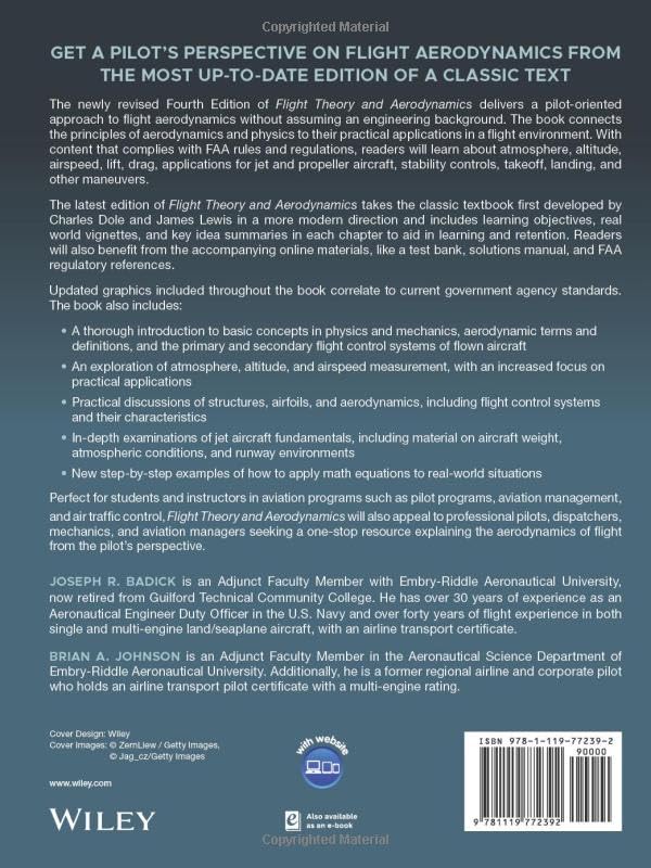FLIGHT THEORY AND AERODYNAMICS GET A PILOT’S PERSPECTIVE ON FLIGHT AERODYNAMICS FROM THE MOST UP-TO-DATE EDITION OF A CLASSIC TEXT The newly revised Fourth Edition of Flight Theory and Aerodynamics delivers a pilot-oriented approach to flight aerodynamics without assuming an engineering background. The book connects the principles of aerodynamics and physics to their practical applications in a flight environment. With content that complies with FAA rules and regulations, readers will learn about atmosphere, altitude, airspeed, lift, drag, applications for jet and propeller aircraft, stability controls, takeoff, landing, and other maneuvers. The latest edition of Flight Theory and Aerodynamics takes the classic textbook first developed by Charles Dole and James Lewis in a more modern direction and includes learning objectives, real world vignettes, and key idea summaries in each chapter to aid in learning and retention. Readers will also benefit from the accompanying online materials, like a test bank, solutions manual, and FAA regulatory references. Updated graphics included throughout the book correlate to current government agency standards. The book also includes: A thorough introduction to basic concepts in physics and mechanics, aerodynamic terms and definitions, and the primary and secondary flight control systems of flown aircraft An exploration of atmosphere, altitude, and airspeed measurement, with an increased focus on practical applications Practical discussions of structures, airfoils, and aerodynamics, including flight control systems and their characteristics In-depth examinations of jet aircraft fundamentals, including material on aircraft weight, atmospheric conditions, and runway environments New step-by-step examples of how to apply math equations to real-world situations Perfect for students and instructors in aviation programs such as pilot programs, aviation management, and air traffic control, Flight Theory and Aerodynamics will also appeal to professional pilots, dispatchers, mechanics, and aviation managers seeking a one-stop resource explaining the aerodynamics of flight from the pilot’s perspective.
