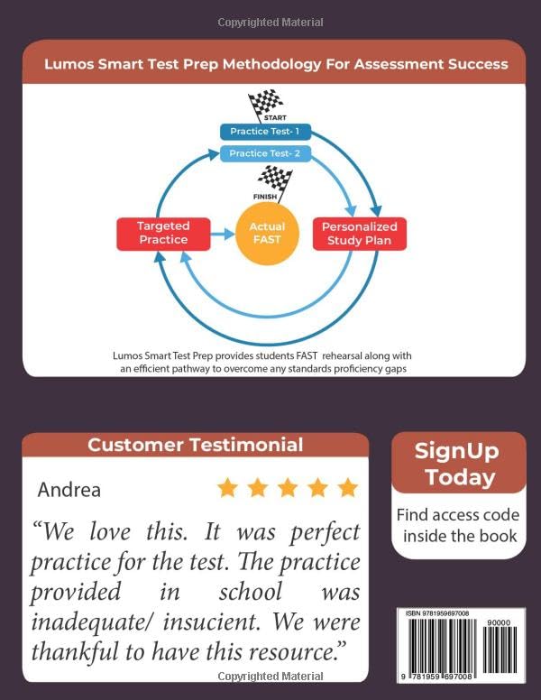 Give Your Child an Edge on the 2025 FAST! Prepare them to excel in the Florida state assessments with confidence and ease Designed by FAST experts, the Lumos Learning 6th Grade English Language Arts Practice Workbook is crafted to boost your child’s test scores by 10-15 points. Featuring hundreds of practice questions fully aligned with Florida’s B.E.S.T. standards, realistic online practice tests, and personalized learning paths, this workbook is tailored to your child’s needs What’s New in the 2024-25 Lumos FAST Grade 6 ELA Workbook? Introducing Lumos AI Tutor: While completing practice tasks, your child receives personalized, guided support with step-by-step explanations, helpful hints, and tailored feedback–just like having a teacher at home! Try it today with your workbook. Comprehensive FAST Prep with 6th Grade ELA Practice Questions Expert-Designed Practice: Hundreds of carefully crafted questions aligned with the FAST test, available in both print and digital formats, covering every essential ELA concept. Comprehensive Coverage: The workbook addresses 40+ ELA skills, including Reading, Communication, and Vocabulary. Realistic Practice Tests: Prepare your child with two full-length practice tests that mirror the exact format and difficulty level of the FAST exam, helping them feel confident and ready for test day. Personalized Study Plan: Based on your child’s performance in the online practice tests, receive a personalized study plan to guide them through targeted remedial practice using the physical workbook. Lumos AI Tutor: Acting as a personal coach, the AI Tutor provides step-by-step guidance, hints, and real-time feedback to keep your child on track and engaged during practice. Progress Tracking: Compare your child’s progress with their peers using easy-to-read performance reports, allowing you to address any learning gaps early. Exclusive Print & Digital Resources What’s Included in the Printed Workbook? Three chapters covering all Florida ELA standards Answer keys with detailed explanations Exclusive Online Resources Two full-length practice tests mirroring the 2025 FAST exam Personalized study plans for targeted remedial practice Engaging test prep resources such as guided practice questions, solved examples, videos, mind maps, flashcubes, and more A user-friendly dashboard with detailed performance reports Lumos AI Tutor for personalized support during practice Why Parents Trust Lumos tedBook for Florida State Tests With over 17 years of experience, Lumos Learning has helped more than 1.3 million students, 164,600 teachers, and 58,100 schools improve their test outcomes. Our Smart Test Prep Methodology ensures your child is fully prepared for the 2025 FAST. A Workbook Designed for Year-Round Learning Whether for classroom instruction, at-home practice, homeschooling, or tutoring, the Lumos FAST ELA Workbook provides an engaging and effective way to prepare for the Florida state tests. Don’t wait–give your child the advantage they need for the 2025 FAST with the Lumos tedBook. Order today and start preparing for success!