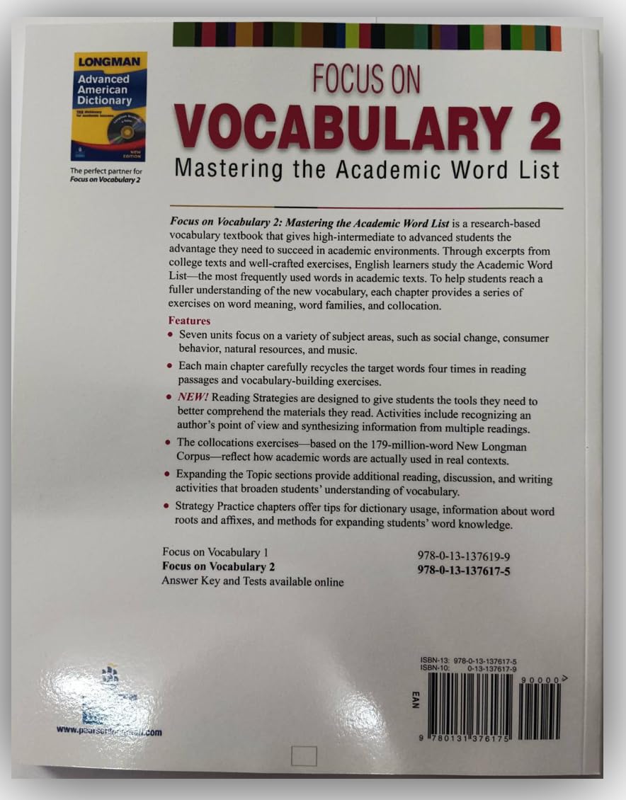 Focus on Vocabulary 2: Mastering the Academic Word List is a research-based vocabulary textbook that gives high-intermediate to advanced students the advantage they need to succeed in academic environments. Through excerpts from college texts and well-crafted exercises, English learners study the Academic Word List – the most frequently used words in academic texts. To help students reach a fuller understanding of the new vocabulary, each chapter provides a series of exercises on word meanings, word families, and collocation. Features Seven units focus on a variety of subject areas, such as social change, consumer behavior, natural resources, and music. Each main chapter carefully recycles the target words four times in reading passages and vocabulary-building exercises. NEW! Reading Strategies are designed to give students the tools they need to better comprehend the materials they read. Activities include recognizing an author’s point of view and synthesizing information from multiple readings. The collocations exercises – based on the 179-million-word New Longman Corpus – reflect how academic words are actually used in real contexts. Expanding the Topic sections provide additional reading, discussion, and writing activities that broaden students’ understanding of vocabulary. Strategy Practice chapters offer tips for dictionary usage, information about word roots and affixes, and methods for expanding students’ word knowledge.