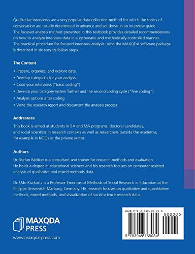 Qualitative interviews are a very popular data collection method for which the topics of conversation are usually determined in advance and set down in an interview guide. The focused analysis method presented in this textbook provides detailed recommendations on how to analyze interview data in a systematic and methodically controlled manner. The practical procedure for focused interview analyses using the MAXQDA software package is described in six easy-to-follow steps: 1. Prepare, organize, and explore data 2. Develop categories for your analysis 3. Code your interviews (“basic coding”) 4. Develop your category system further and the second coding cycle (“fine coding”) 5. Analysis options after coding 6. Write the research report and document the analysis process