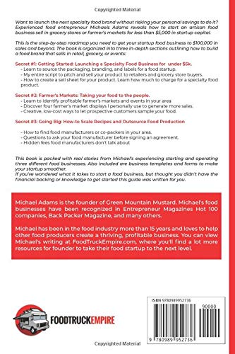 Want to launch the next specialty food brand without risking your personal savings to do it? Experienced food entrepreneur Michaels Adams reveals how to start an artisan food business sell in grocery stores or farmer’s markets for less than $5,000 in startup capital. This is the step-by-step roadmap you need to get your startup food business to it’s first $100,000 in sales and beyond. This book is organized into three in-depth sections that reveal essential components of creating and selling a food product that sells in retail or at events: Secret #1: Getting Started: Launching a Specialty Food Business for under $5k. Learn to source the packaging, branding, and labels for a food startup. My entire script to pitch and sell your product to retailers and grocery store buyers. How to create a sell sheet for your product. Learn how much to charge for a specialty food product. Secret #2: Farmer’s Markets: Taking your product to the people. Learn to identify profitable farmer’s markets and events in your areaDiscover four farmer’s market displays I personally use to generate more sales. Creative, low-cost ways to let prospective customers sample your food.Secret #3: Going Big: How-to Scale Recipes and Outsource Food ProductionHow to find food manufacturers or co-packers in your area. Questions to ask your food manufacturer before signing an agreement.Hidden fees food manufacturers don’t talk about. This book is packed with dozens of stories from Michael’s experiencing starting and operating three different food businesses. Also included as a bonus are business templates and forms that will make your startup process easier. If you’ve dreamed of starting a food business, but thought you didn’t have the financial backing or knowledge to get started this guide was written for you. About the AuthorMichael Adams is the founder of Green Mountain Mustard. Michael’s food businesses have been recognized in Entrepreneur Magazines Hot 100 companies, Back Packer Magazine, and many others. He’s been in the food industry more than 15 years and loves to help other food producers create a thriving, profitable business. You can view Michael’s writing at FoodTruckEmpire.com, where you’ll find a lot more resources for food business owners to take their business to the next level.