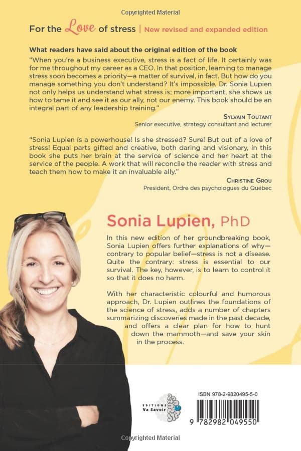 For the Love of Stress Learn the mechanism of human stress and you will be able to maximise well-being and performance under stress In this new edition of her groundbreaking book, Sonia Lupien offers further explanations of why– contrary to popular belief–stress is not a disease. Quite the contrary: stress is essential to our survival. The key, however, is to learn to control it so that it does no harm. With her characteristic colourful and humorous approach, Dr. Lupien outlines the foundations of the science of stress, adds a number of chapters summarizing discoveries made in the past decade, and offers a clear plan for how to hunt down the mammoth–and save your skin in the process.