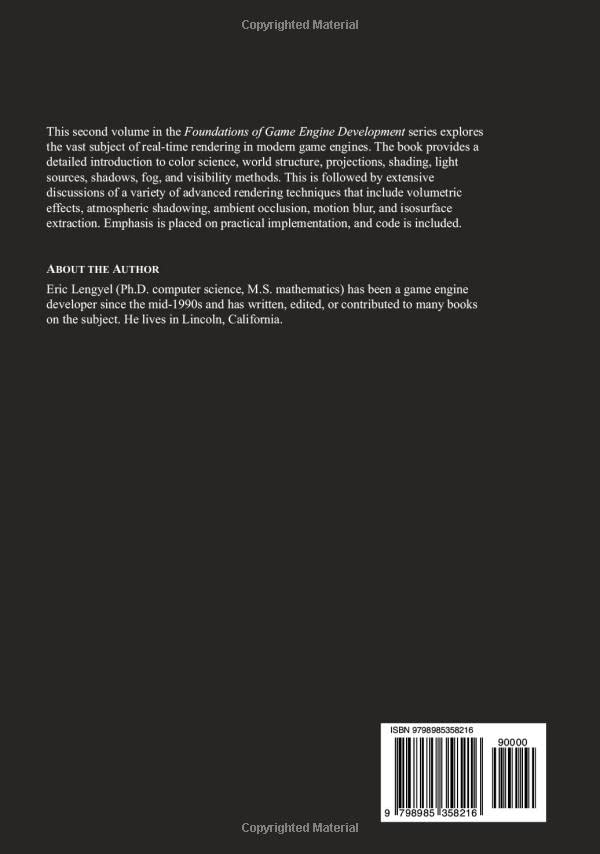 This second volume in the Foundations of Game Engine Development series explores the vast subject of real-time rendering in modern game engines. The book provides a detailed introduction to color science, world structure, projections, shaders, lighting, shadows, fog, and visibility methods. This is followed by extensive discussions of a variety of advanced rendering techniques that include volumetric effects, atmospheric shadowing, ambient occlusion, motion blur, and isosurface extraction. Emphasis is placed on practical implementation, and code is included.