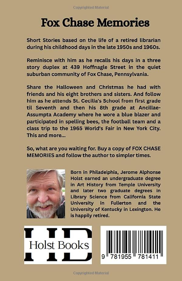 FOX CHASE MEMORIES is filled with short stories based on the life of a retired librarian when he lived in Philadelphia in the late 1950s and 1960s. Reminisce with him as he recalls his days in a three story duplex at 439 Hoffnagle Street in the quiet suburban community of Fox Chase, Pennsylvania. Share the Halloween and Christmas he had with friends and his eight brothers and sisters. And follow him as he attends St. Cecilia’s School from first grade til Seventh and then his 8th grade at Ancillae/Assumpta Academy where he wore a blue blazer and participated in spelling bees, the football team and a class trip to the 1965 World’s Fair in New York City. This and more… So, what are you waiting for. Buy a copy of FOX CHASE MEMORIES and follow the author back to simpler times.
