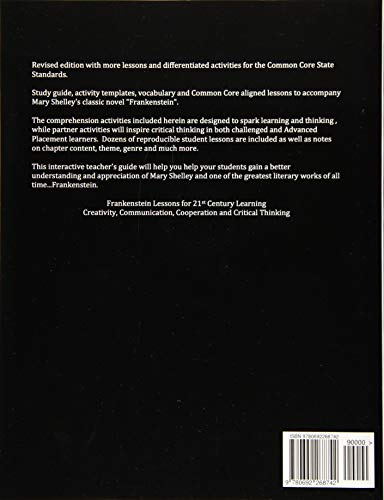 Revised edition with more lessons and differentiated activities for the Common Core State Standards. Study guide, activity templates, vocabulary and Common Core aligned lessons to accompany Mary Shelley’s classic novel “Frankenstein”.The comprehension activities included herein are designed to spark learning and thinking, while partner activities will inspire critical thinking in both challenged and Advanced Placement learners. Dozens of reproducible student lessons are included as well as notes on chapter content, theme, genre and much more.This interactive teacher’s guide will help you help your students gain a better understanding and appreciation of Mary Shelley and one of the greatest literary works of all time…Frankenstein.Frankenstein Lessons for 21st Century LearningCreativity, Communication, Cooperation and Critical Thinking. This book is designed with both repeating and scaffolding activities to help teachers help all learners access this timeless classic.