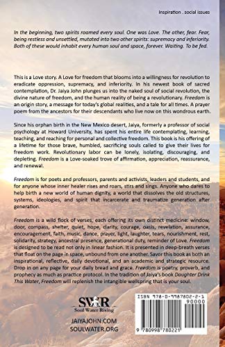 In the beginning, two spirits roamed every soul. One was Love. The other, fear. Fear, being restless and unsettled, mutated into two other spirits: supremacy and inferiority. Both of these would inhabit every human soul and space, forever. Waiting. To be fed. This is a Love story. A Love for freedom that blooms into a willingness for revolution to eradicate oppression, supremacy, and inferiority. In his newest book of sacred contemplation, Dr. Jaiya John plunges us into the naked soul of social revolution, the divine nature of freedom, and the human reality of being a revolutionary. Freedom is an origin story, a message for today’s global realities, and a tale for all times. A prayer poem from the ancestors. Since his orphan birth in the New Mexico desert, Jaiya, formerly a professor of social psychology at Howard University, has spent his entire life contemplating, learning, teaching, and reaching for personal and collective freedom. This book is his offering of a lifetime for those brave, humbled, sacrificing souls called to give their lives for freedom work. Revolutionary labor can be lonely, isolating, discouraging, and depleting. Freedom is a Love-soaked trove of affirmation, appreciation, reassurance, and renewal. Freedom is for poets and professors, parents and activists, leaders and students, and for anyone whose inner healer rises and roars, stirs and sings. Anyone who dares to help birth a new world of human dignity, a world that dissolves the old structures, systems, ideologies, and spirit that incarcerate and traumatize generation after generation. Freedom is a wild flock of verses, each offering its own distinct medicine: window, door, compass, shelter, quiet, hope, clarity, courage, oasis, revelation, assurance, encouragement, faith, music, dance, prayer, light, laughter, tears, nourishment, rest, solidarity, strategy, ancestral presence, generational duty, reminder of Love. Freedom is presented in deep-breath verses that float on the page in space, unbound from one another. Savor this book as both an inspirational, reflective, daily devotional, and an academic and strategic resource. Drop in on any page for your daily bread and grace. Freedom is poetry, proverb, and prophecy as much as practice protocol. In the tradition of Jaiya’s book Daughter Drink This Water, Freedom will replenish the intangible wellspring that is your soul.