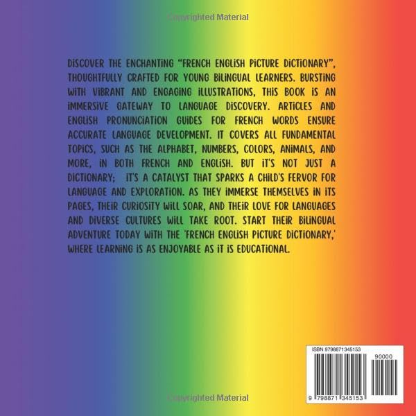 Discover the enchanting “French English Picture Dictionary”, thoughtfully crafted for young bilingual learners. Bursting with vibrant and engaging illustrations, this book is an immersive gateway to language discovery. Articles and English pronunciation guides for French words ensure accurate language development. It covers all fundamental Topics, such as the alphabet, numbers, colors, animals, and more, in both French and English. But it’s not just a dictionary; it’s a catalyst that sparks a child’s fervor for language and exploration. As they immerse themselves in its pages, their curiosity will soar, and their love for languages and diverse cultures will take root. Start their bilingual adventure today with the ‘French English Picture Dictionary,’ where learning is as enjoyable as it is educational. 34 colorful pages full of words More than 250 new words from all fundamental topics Vibrant and eye-catching illustrations French with English translations English pronunciations for French words