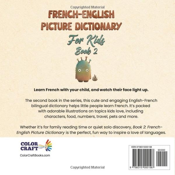 Want your child to love languages early? Practice French together with this book, and watch their face light up. The second book in the series, this cute and engaging English-French bilingual dictionary helps little people learn French. It’s packed with adorable illustrations on topics kids love, including characters, food, numbers, travel, pets and more. This unique bilingual picture dictionary is the perfect start to language learning — even if you and your child are both complete beginners. A fun, stress-free way to make learning a second language a natural part of their life. Not sure where to start with kids’ language learning? We believe kids learn best when they’re having fun. Book 2: French-English Picture Dictionary is the perfect, exciting way to inspire a love of languages. Imagine your child being proud they can speak French, telling their friends about it, and recognizing words in French during playtime. They could be pointing out colors, naming animals, and confidently saying words they’ve learned–all without frustration. That’s what this book is designed to do! In this book, kids will discover: Over 200 essential French words, with English translations and pronunciation Adorable boho-style, cute illustrations to make every word memorable 15+ engaging themes, including animals, colors, family, school, sports, and more Real-world vocabulary–words kids will actually use in daily life Pronunciation support so kids and parents can learn together with confidence Encourages cultural curiosity–kids love discovering new languages! Family-friendly learning–great for parents, grandparents, and teachers A fun way to introduce a second language without pressure or boredom Reusable and easy to revisit–kids will love flipping through again and again A great gift idea for bilingual families or anyone who wants to encourage language learning What if I don’t speak French? No worries! Every word comes with pronunciation guides, so you and your child can learn together. Will my child actually use these words? Yes! The book focuses on everyday vocabulary–words they’ll hear, see, and use in real life. Think pets, numbers, nature and food. And more! What if my child loses interest? The adorable illustrations and fun themes make it feel like a game, keeping kids excited to turn the pages. French a useful and beautiful language, spoken by over 300 million people worldwide. Want your child to build a love for languages from an early age? Start with this book–grab your copy now!