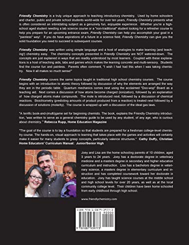 Friendly Chemistry is a truly unique approach to teaching introductory chemistry. Used by home schoolers and charter, public and private school students world-wide for over ten years, Friendly Chemistry presents what is often considered an intimidating subject as a genuinely fun, enjoyable experience. Whether you’re a high-school aged student needing a lab science course or a “non-traditional” student looking for a refresher course to help you prepare for an upcoming entrance exam, Friendly Chemistry can help you accomplish your goal in a “painless” way! If you do have aspirations of a future in a science field, Friendly Chemistry can give you the solid foundation you need to succeed in subsequent courses. Friendly Chemistry was written using simple language and a host of analogies to make learning (and teaching!) chemistry easy. The chemistry concepts presented in Friendly Chemistry are NOT watered-down. The concepts are just explained in ways that are readily understood by most learners. Coupled with these explanations is a host of teaching aids, labs and games which makes the learning concrete and multi-sensory. Students find the course fun and painless. Parents often comment, “I wish I had had this when I was taking chemistry. Now it all makes so much sense!” Friendly Chemistry covers the same topics taught in traditional high school chemistry courses. The course begins with an introduction to atomic theory followed by discussion of why the elements are arranged the way they are in the periodic table. Quantum mechanics comes next using the acclaimed “Doo-wop” Board as a teaching aid. Next comes a discussion of how atoms become charged (ionization), followed by an explanation of how charged atoms make compounds. The mole is introduced next, followed by a discussion of chemical reactions. Stoichiometry (predicting amounts of product produced from a reaction) is treated next followed by a discussion of solutions (molarity). The course is wrapped up with a discussion of the ideal gas laws. Please note that this is the STUDENT EDITION. Volumes 1 and 2 of the TEACHER”S EDITION must be purchased separately in order to have all materials necessary to complete this chemistry course. More information regarding Friendly Chemistry including answers to many frequently asked questions may be found at www.friendlychemistry.com.