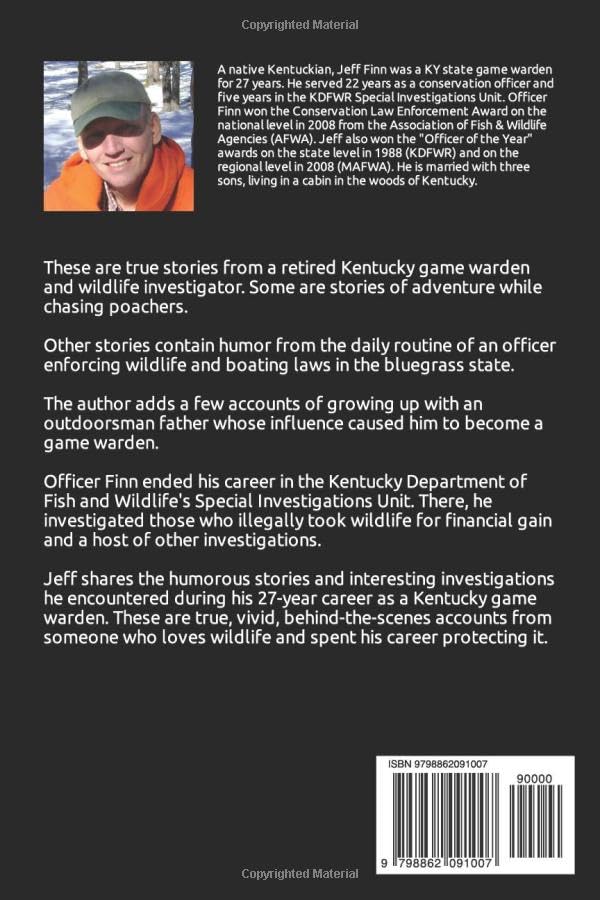 This book is a second volume of true stories from a retired Kentucky game warden. Some are stories of adventure while chasing poachers. Others contain humor from the daily routine of an officer enforcing wildlife and boating laws in the bluegrass state. The author adds a few accounts of growing up with an outdoorsman father whose influence caused him to become a game warden. Officer Finn ended his career in the Kentucky Department of Fish and Wildlife’s Special Investigations Unit. There, he investigated those who illegally took wildlife for financial gain and a host of other investigations. Jeff shares the humorous stories and interesting investigations he encountered during his 27-year career as a Kentucky game warden. These are true, vivid, behind-the-scenes accounts from someone who loves wildlife and spent his career protecting it.