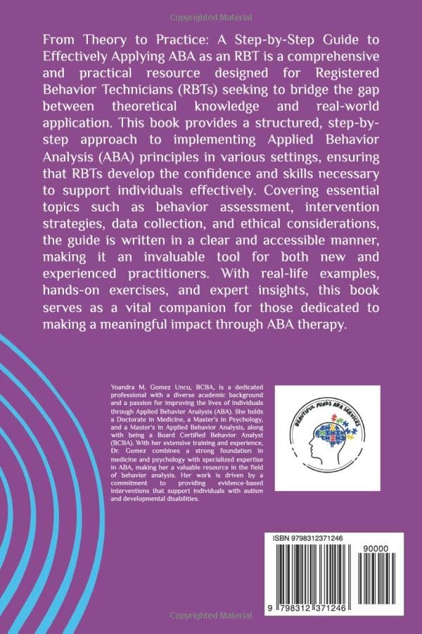 From Theory to Practice: A Step-by-Step Guide to Effectively Applying ABA as an RBTis a comprehensive and practical resource designed for Registered Behavior Technicians (RBTs) seeking to bridge the gap between theoretical knowledge and real-world application. This book provides a structured, step-by-step approach to implementing Applied Behavior Analysis (ABA) principles in various settings, ensuring that RBTs develop the confidence and skills necessary to support individuals effectively. Covering essential topics such as behavior assessment, intervention strategies, data collection, and ethical considerations, the guide is written in a clear and accessible manner, making it an invaluable tool for both new and experienced practitioners. With real-life examples, hands-on exercises, and expert insights, this book serves as a vital companion for those dedicated to making a meaningful impact through ABA therapy.
