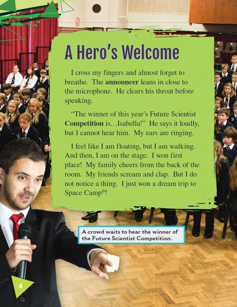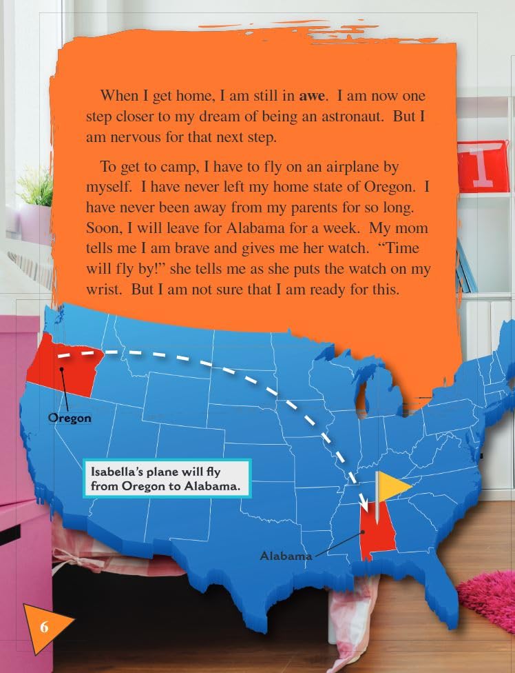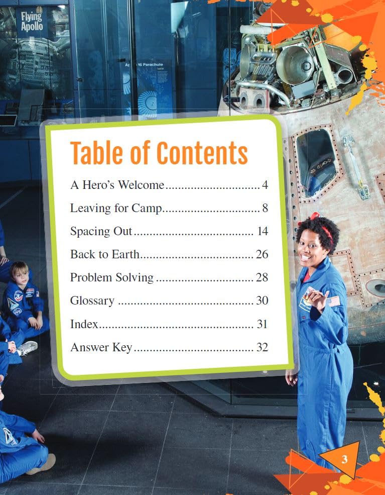 Have you ever wondered what Space Camp is like? Join Isabella as she moon walks through the Moon Room, takes a ride in a Multi-Axis Trainer, tackles the Mars Climbing Wall, and takes the helm at Mission Control. Along the way, you’ll practice measuring time. This fiction math book seamlessly integrates the teaching of math and reading, and uses real-world examples to teach math concepts. Text features include images, a glossary, an index, captions, and a table of contents to build students’ vocabulary and reading comprehension skills as they interact with the text. The rigorous practice problems, sidebars, and math diagrams extend the learning experience and provide multiple opportunities for students to practice what they have learned. The Math Talk section provides an in-depth problem-solving experience to challenge higher-order thinking skills.