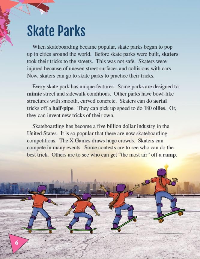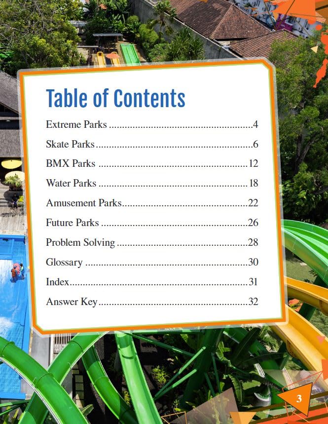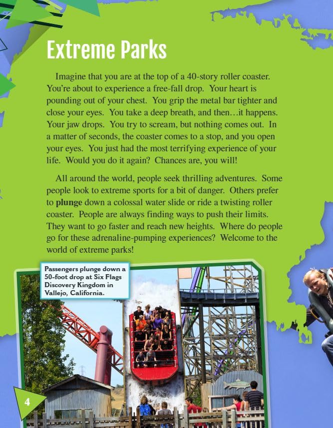 Students will develop their math skills as they analyze the angles found in extreme sports parks from around the world. This book seamlessly integrates the teaching of math and reading, and uses real-world examples to teach geometry concepts. Text features include a glossary, an index, captions, and a table of contents to increase students’ vocabulary and reading comprehension skills as they interact with the text. The rigorous practice problems, math charts and diagrams, and sidebars provide many opportunities for students to practice their developing math skills, and apply what they’ve learned to their everyday lives. Math Talk provides an in-depth opportunity for further thinking, requiring the use of higher-order thinking skills.