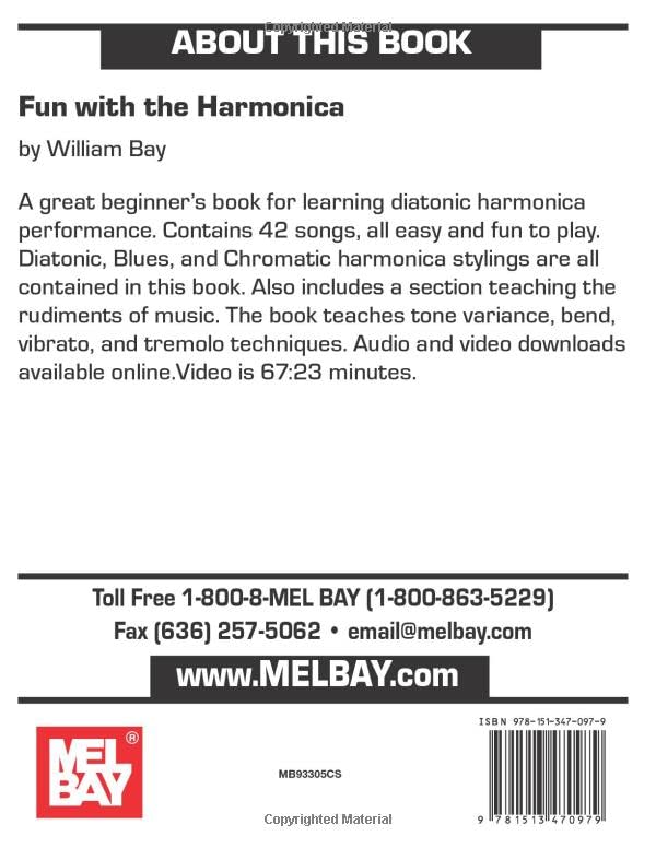 A great beginner’s book for learning diatonic harmonica performance. Contains 42 songs, all easy and fun to play. Diatonic, Blues, and Chromatic harmonica stylings are all contained in this book. Also includes a section teaching the rudiments of music. The book teaches tone variance, bend, vibrato, and tremolo techniques. Includes access to online audio and video. Video is 67:23 minutes in length.