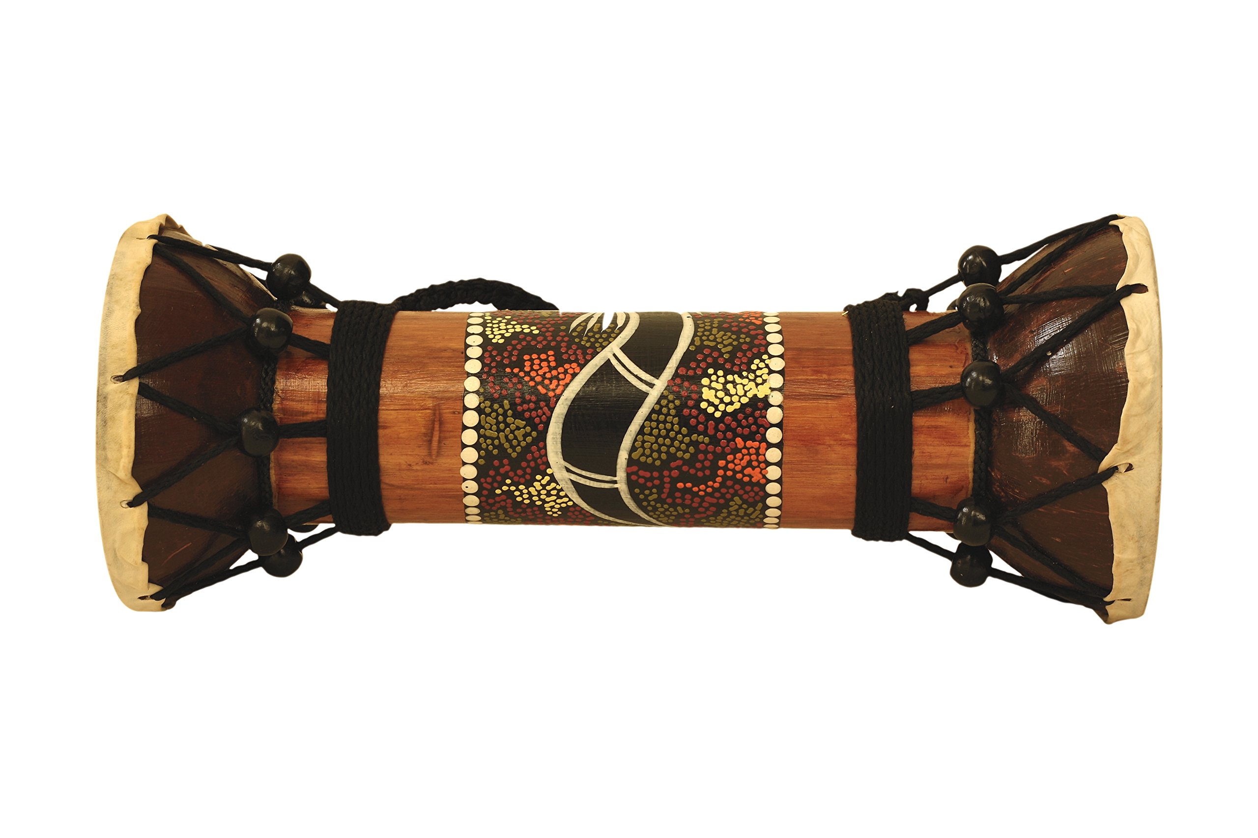 Hand made from albiza wood, this double sided drum with bring a touch of exotic beauty to your home decor. Each side has a white drum head lashed down with black cord and beads. The center of the drum is decorated with a stylized native image of a white lizard and red, green and orange dots