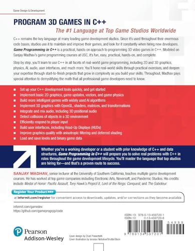 Program 3D Games in C++: The #1 Language at Top Game Studios Worldwide C++ remains the key language at many leading game development studios. Since it’s used throughout their enormous code bases, studios use it to maintain and improve their games, and look for it constantly when hiring new developers. Game Programming in C++ is a practical, hands-on approach to programming 3D video games in C++. Modeled on Sanjay Madhav’s game programming courses at USC, it’s fun, easy, practical, hands-on, and complete. Step by step, you’ll learn to use C++ in all facets of real-world game programming, including 2D and 3D graphics, physics, AI, audio, user interfaces, and much more. You’ll hone real-world skills through practical exercises, and deepen your expertise through start-to-finish projects that grow in complexity as you build your skills. Throughout, Madhav pays special attention to demystifying the math that all professional game developers need to know. Set up your C++ development tools quickly, and get started Implement basic 2D graphics, game updates, vectors, and game physics Build more intelligent games with widely used AI algorithms Implement 3D graphics with OpenGL, shaders, matrices, and transformations Integrate and mix audio, including 3D positional audio Detect collisions of objects in a 3D environment Efficiently respond to player input Build user interfaces, including Head-Up Displays (HUDs) Improve graphics quality with anisotropic filtering and deferred shading Load and save levels and binary game data Whether you’re a working developer or a student with prior knowledge of C++ and data structures, Game Programming in C++ will prepare you to solve real problems with C++ in roles throughout the game development lifecycle. You’ll master the language that top studios are hiring for–and that’s a proven route to success.