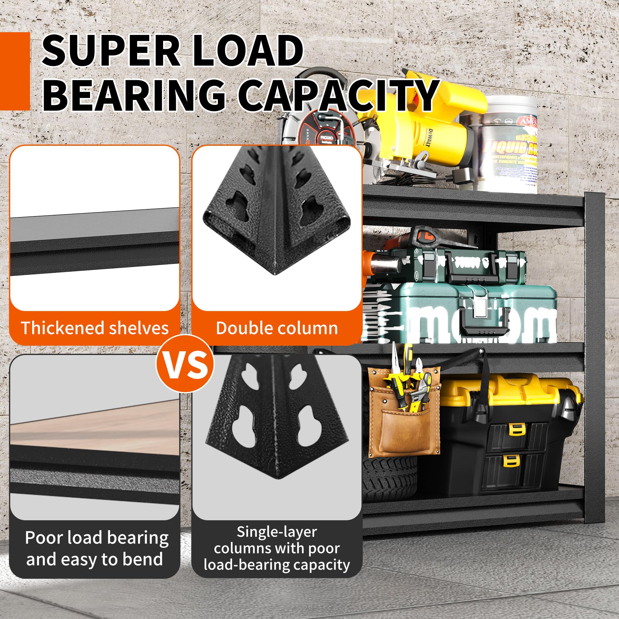 - [(METAL HEAVY DUTY GARAGE SHELVING)] This steel metal shelf is made of heavy-duty steel,the metal shelves and columns are made of double-layer metal material,each sturdy thickened garage racks for storage have support beam underneath,After mounting securely,each metal shelves for storage layer can hold up to 400 lbs,so it’s more stable and durable than ordinary plastic or fragile wood plank metal storage shelves won’t bend due to placing heavy objects,can hold suitable for oil drums,tires,heavy duty toolboxes and other heavy objects.