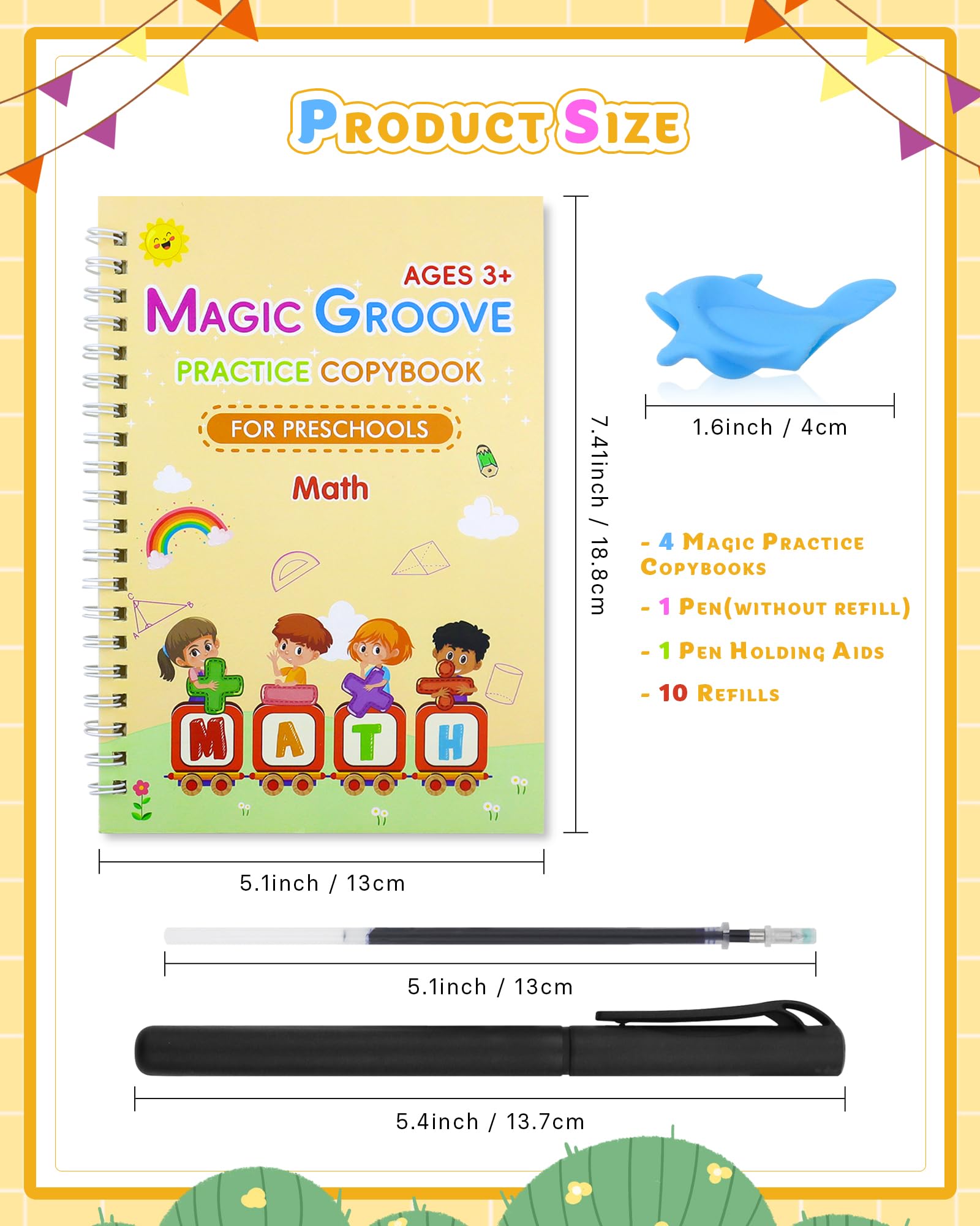 • [(4 In 1 Copybook Set)] : The package includes 4 magic practice copybooks for kids (Alphabet, Number, Drawing, Math ) + 1 Pen ( without refill) + 1 Pen Holding Aids + 10 refills.