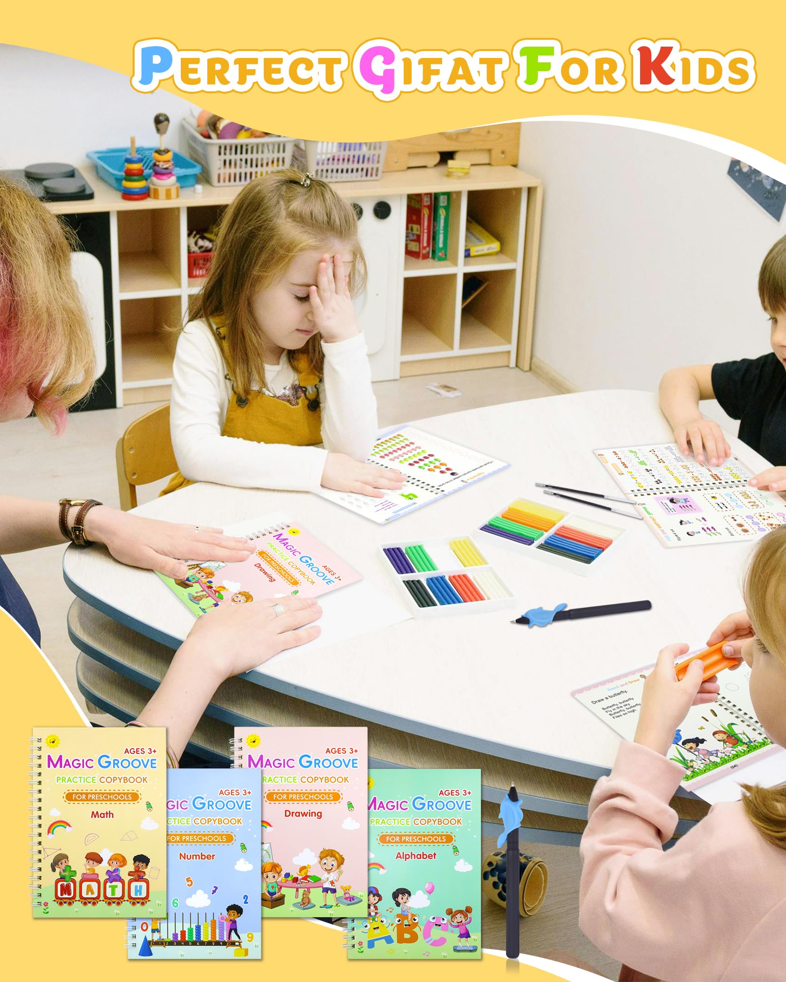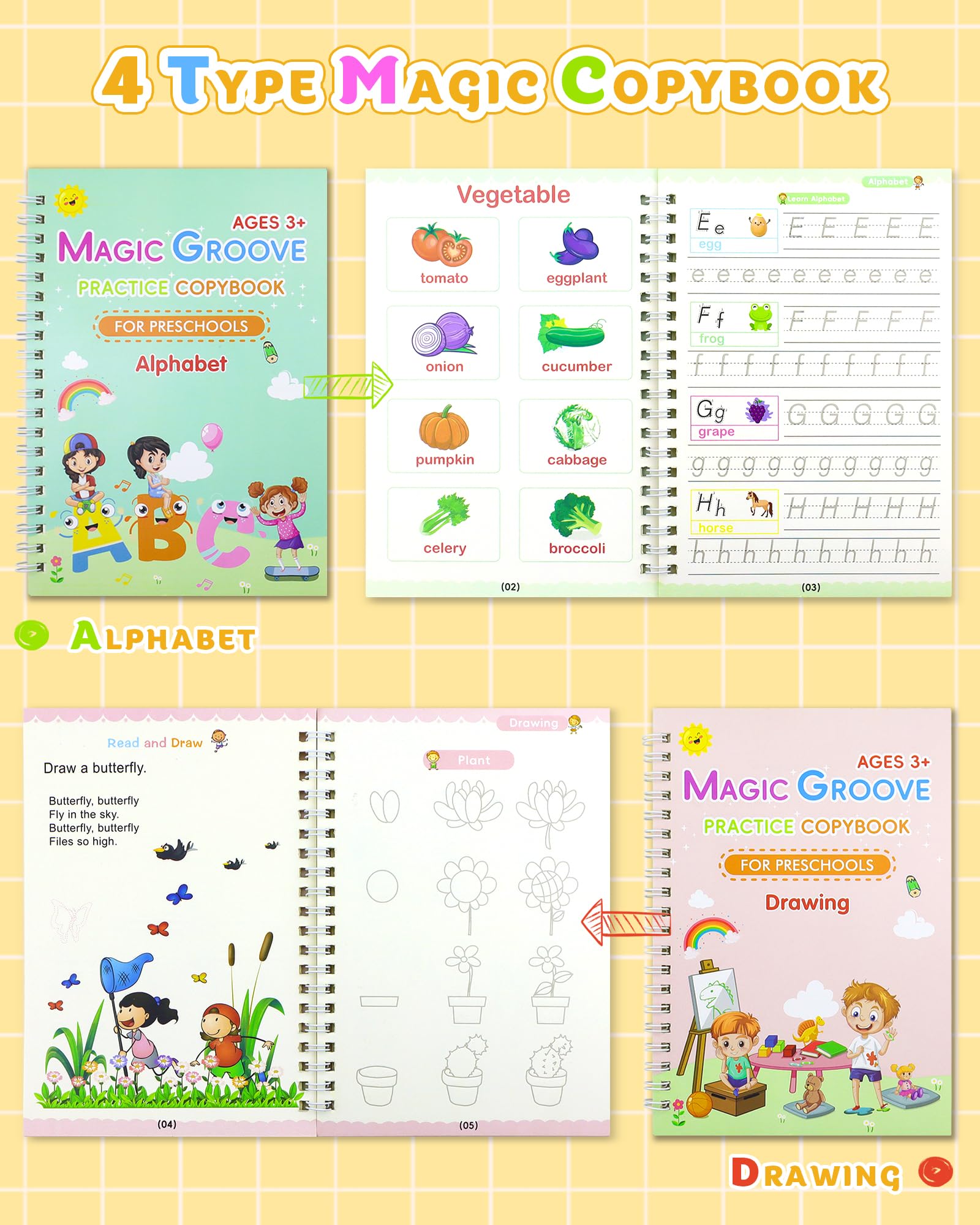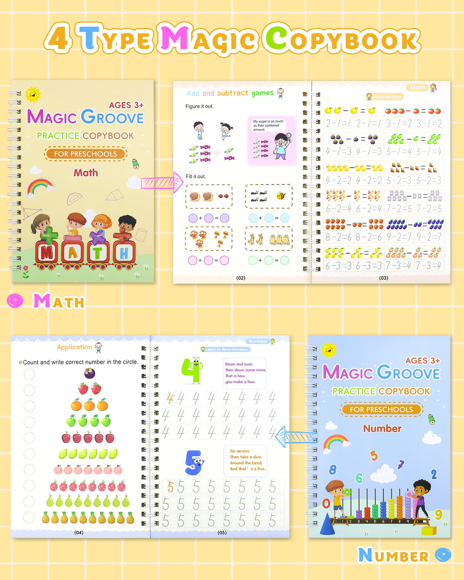 GAUENEEN Magic Practice Copybook, Reusable Writing Practice Book, Handwriting Aid for Preschool Kids Age 3-8 (4 Books with Pens)