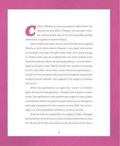 This fully illustrated book celebrates the history of thirty trans, gender expansive, and nonbinary heroes throughout the world. Explore the history of trans and nonbinary people throughout the world in this gorgeously illustrated nonfiction book for young teens. Readers will be educated and enlightened about gender-expansive people who have made a difference in our history and who continue to help raise awareness of diversity and inclusion in current society. Introductory materials give readers an insight into pronoun usage, the history of the word “transgender,” and more before providing engaging and fascinating information about thirty trans, gender expansive, and nonbinary people who have helped shape our world. From Callon of Epidaurus (the first intersex individual to receive surgery) to Elliot Page (a trans actor) to Tomoya Hosoda (the first trans politician in Japan), this book will open up dialogue and help educate young adults on the history, legacy, and future of trans, gender expansive, and nonbinary people and their rights at a time when protecting those rights is needed more than ever. The book is complete with sidebars about trans topics, a reference guide, and a glossary of terminology.