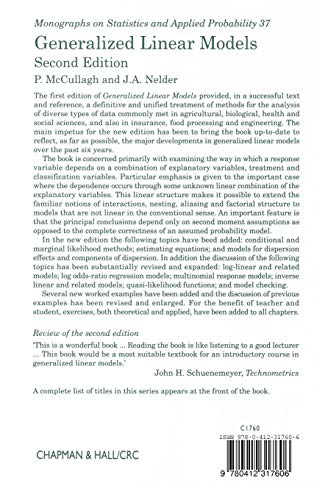 The success of the first edition of Generalized Linear Models led to the updated Second Edition, which continues to provide a definitive unified, treatment of methods for the analysis of diverse types of data. Today, it remains popular for its clarity, richness of content and direct relevance to agricultural, biological, health, engineering, and other applications. The authors focus on examining the way a response variable depends on a combination of explanatory variables, treatment, and classification variables. They give particular emphasis to the important case where the dependence occurs through some unknown, linear combination of the explanatory variables. The Second Edition includes topics added to the core of the first edition, including conditional and marginal likelihood methods, estimating equations, and models for dispersion effects and components of dispersion. The discussion of other topics-log-linear and related models, log odds-ratio regression models, multinomial response models, inverse linear and related models, quasi-likelihood functions, and model checking-was expanded and incorporates significant revisions. Comprehension of the material requires simply a knowledge of matrix theory and the basic ideas of probability theory, but for the most part, the book is self-contained. Therefore, with its worked examples, plentiful exercises, and topics of direct use to researchers in many disciplines, Generalized Linear Models serves as ideal text, self-study guide, and reference.