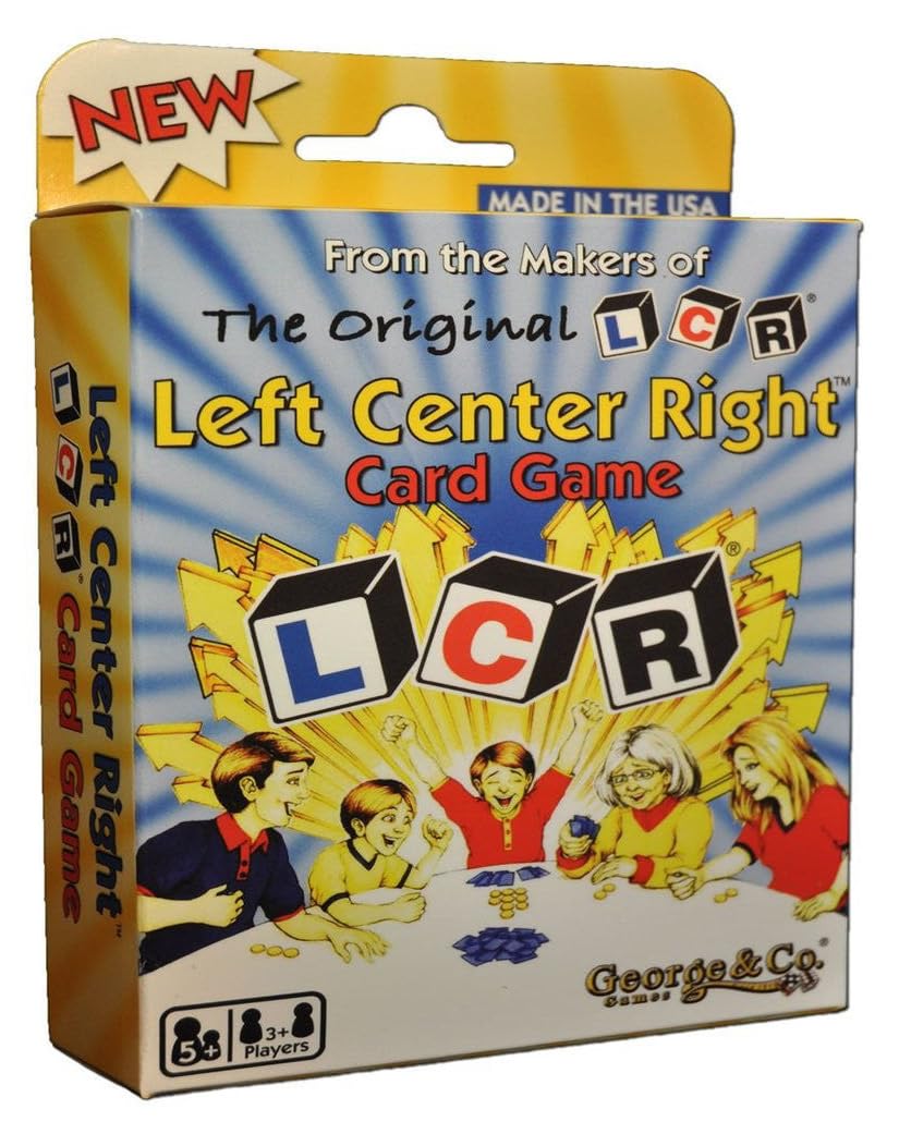 LCR Left Center Right Card Game is played just like the Original LCR dice game. Instead of rolling dice, this game is played by flipping over the specialty marked cards. The playing cards are marked with L’s, C’s, R’s and dots, which determine where the players chips will go. The last player with chips, wins the game. Included are 110 specialty marked LCR cards, 24 playing chips, and instructions.