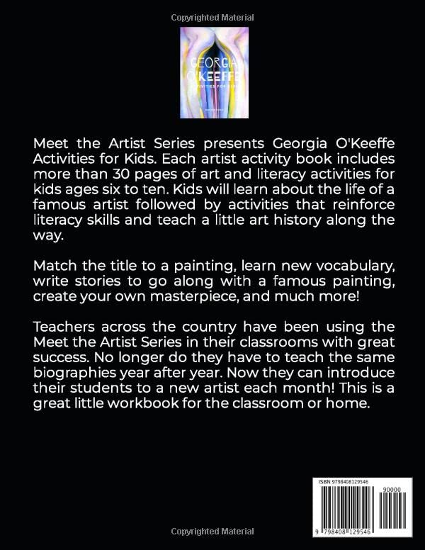 Meet the Artist Series presents Georgia O’Keeffe Activities for Kids. Each artist activity book includes more than 30 pages of art and literacy activities for kids ages six to ten. Kids will learn about the life of a famous artist followed by activities that reinforce literacy skills and teach a little art history along the way. Match the title to a painting, learn new vocabulary, write stories to go along with a famous painting, create your own masterpiece, and much more! Teachers across the country have been using the Meet the Artist Series in their classrooms with great success. No longer do they have to teach the same biographies year after year. Now they can introduce their students to a new artist each month! This is a great little workbook for the classroom or home. Note: Parents and teachers have requested different versions of the Meet the Artist Series books focused on different paintings by the same artist. This book has activities based on O’Keeffe’s Grey Line With Black, Blue and Yellow. Other versions are all available in the Series. Features & Highlights: Age-appropriate biography written by a former teacher contains simple language and explains art concepts to children. Designed to use art to reinforce literacy skills and inspire creativity in girls and boys ages 6 -10, while giving them an opportunity to express themselves creatively. A Great Gift for Any Child: If you’re looking for an activity for your school-aged child, this educational activity book is a great way to engage children in the arts. This is not just a coloring book. Children will learn about the lives of famous artists while reinforcing literacy skills!