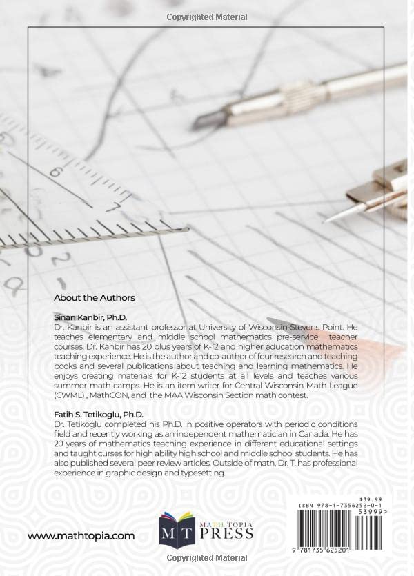 Geotopia Volume 1 is a comprehensive guide to triangle and polygon geometry. This book is designed to be highly accessible and student-friendly, making complex geometric concepts easily understandable. Authored by two seasoned mathematics educators and mathematicians who bring their vast experience in teaching and mathematics to the forefront, the book is a rich resource for anyone involved in mathematics education. Key features of “Geotopia Volume 1” include: 240 Examples and Full Solutions: Detailed explanations to enhance understanding. 450 Tests and Contest Problems: A wide range of challenges to test skills. 160 QR and Video Solutions: Innovative and interactive learning methods. 80 Theorems and Proofs: Fundamental principles thoroughly explained. The target audience of this book Mathematics Contest Participants: Ideal for those in AMC 10/12, MathCON, MATHCOUNTS, and Math Leagues. Geometry and Honors Geometry Students: Perfect for students seeking to deepen their understanding of geometry. Parents of Mathematically Gifted Students: A valuable tool for aiding their children’s learning. Pre-service and In-Service Mathematics Teachers: An excellent reference for teaching geometry. Geometry Puzzle and Math Enthusiasts: A treasure trove of puzzles and problems to explore.