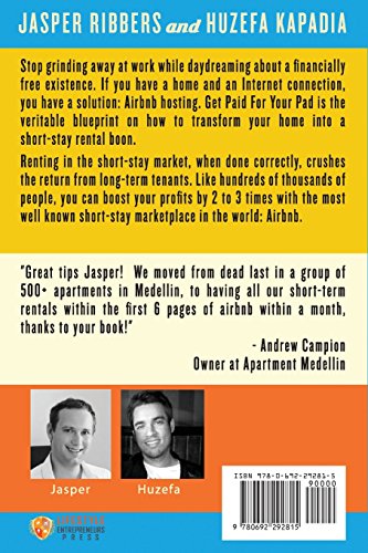 How To Make Money On Airbnb If you have a home and an Internet connection, you may very well be sitting on a goldmine. You could be making hundreds of dollars a night. Even just renting out a spare room could bring in well over $1000 a month! Renting in the short-stay market, when done correctly, crushes the return from long-term tenants. Like hundreds of thousands of people, you can boost your rental profits by 2 to 3 times with the most well known short-stay marketplace in the world: Airbnb. If you have a home or spare room that is ever empty (when you are on holiday for example) you are missing out on significant rental income! Things you’ll learn in this book: This step-by-step guide to renting your home on the Airbnb platform teaches you in detail how to take advantage of this opportunity. It covers: * How Jasper went from making $24,000 per year to $60,000 from his apartment in Amsterdam * How to prepare your home like a 5-star hotel in a cost-effective manner * How to set up a dazzling and polished Airbnb listing from start to finish * How to communicate with guests in a professional and responsive way * How to scientifically calculate an optimal price point for profit maximization * How to catapult your search rank within the Airbnb platform **This book comes with a FREE audio book** Get Paid For Your Pad is the definitive book for Airbnb hosts and includes: *little known tips & tricks to optimize your listing *examples from real, profitable Airbnb listings *stories and strategies from successful Airbnb hosts *”Do This Now” action items to get your listing ready for primetime *easy-to-implement tactics and turn-key templates… … that can be employed to launch and optimize your Airbnb business right away!