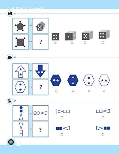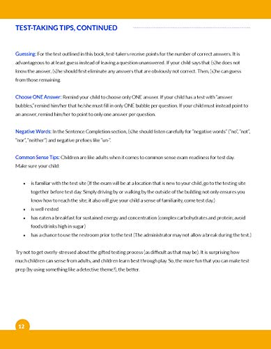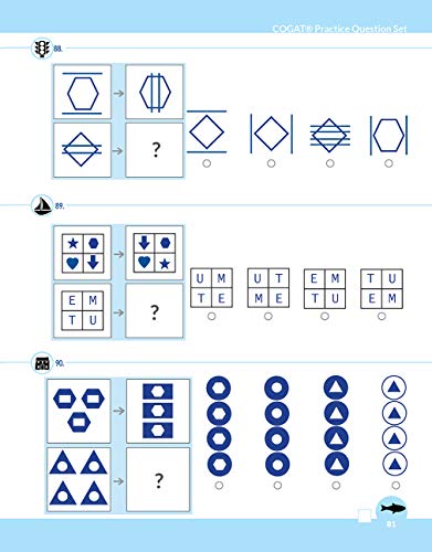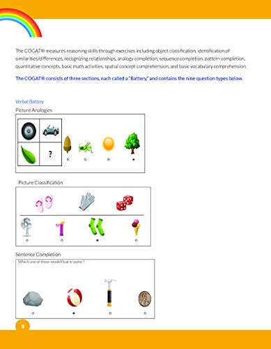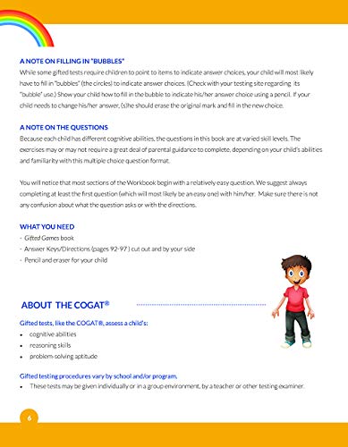 Help your child do his/her best on the COGAT! Don’t risk your son or daughter being unprepared and underperforming on test day. Your child must be familiar with test material AND be able to focus for longer than the typical 4-5 minute attention span of most young kids. This book offers a chance to do both. Ensure your child is ready for test day, thanks to this book’s 190+ practice questions. Make sure (s)he has acquired the mental stamina to focus on test questions with the book’s COGAT Level 8 Practice Test (the book’s “Practice Question Set”). Pinpoint your child’s areas of strength/weakness with the practice test answer key. Capture your child’s attention with bright, colorful illustrations and fun characters: full-color pages. Help them pass the test, thanks to thorough coverage of the COGAT Level 8 test sections: Picture Analogies, Picture Classification, Sentence Completion, Figure Analogies, Figure Classification, Paper Folding, Number Analogies, Number Puzzles, and Number Series. (Note: If your child will take the COGAT, please do not purchase our stand-alone OLSAT book also (they contain similar material). Instead, you should just select this book.) Engaging young and boisterous minds with test prep is challenging – that’s why this book features fun characters, child-friendly themes, and colorful illustrations. Such engagement can help kids retain the information they’ll learn in this book – and then apply it on test day! What are your kid’s dreams – to be a doctor, engineer, or astronaut? Gaining acceptance to a G&T program or selective school could determine your child’s educational path – or even his/her future career. Help your child dream big and take the first steps on this exciting educational journey and achieve their dreams. YOU are your child’s best teacher, and this book is here to help! (COGAT is a registered trademark of Houghton Mifflin Harcourt. Houghton Mifflin Harcourt is not affiliated with Gateway Gifted Resources and does not endorse this product.)