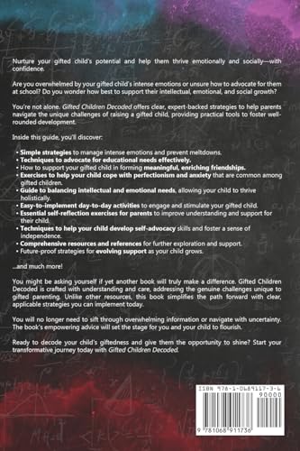 If you’re wondering how to support your gifted child’s unique mind and emotions — whether this is all new to you or already feels a little overwhelming — you’ve come to the right place. Nurture your gifted child’s true potential and help them thrive emotionally and socially — without second-guessing yourself or feeling alone in the process. Do you ever wonder… How do I support my child’s intense emotions without making things worse? Why does parenting such a bright child feel so isolating and overwhelming? How can I advocate in schools that don’t seem to understand giftedness? How do I keep my child intellectually challenged without adding pressure or burnout? You’re not the only one asking these questions. Many parents — and the educators who support them — face the same daily challenges: balancing advanced intellectual needs with emotional sensitivity, social struggles, and systemic gaps in educational support. Gifted Children Decoded is your trusted guide to bridge these gaps — helping both parents and teachers support gifted children holistically. Here’s a sneak peek of what you’ll discover inside: Simple strategies to manage emotional intensity and prevent meltdowns Practical tools to confidently advocate for your child in any school system Ways to support your child in forming meaningful, enriching friendships Exercises to help them cope with perfectionism and anxiety A guide to balancing intellectual and emotional needs, helping your child thrive as a whole person Everyday activities to spark curiosity and keep your child happily engaged Parent-focused reflections to deepen your understanding and strengthen your connection Tools to build self-advocacy and independence in your child Long-term strategies to evolve your support as they grow Comprehensive resources and references for further exploration You might be wondering, “Will yet another book really make a difference?” This one will. Trusted by parents and teachers who face these same challenges every day, Gifted Children Decoded delivers compassionate, clear strategies you can use right now to make a real impact. Unlike other resources, it simplifies the path forward with practical solutions you can start using today. You don’t have to navigate this alone. With the empowering advice in this book, you’ll stop second-guessing and start building the foundation for your child to flourish. Ready to decode your child’s giftedness and give them the opportunity to shine? Scroll up and click “Add to Cart” to begin your journey today!