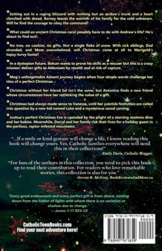 Gifts: Visible and Invisible is a collection of short stories by eight CatholicTeenBooks.com authors. THE OUTLAWS’ FRIEND: Setting out in a raging blizzard with nothing but an outlaw’s trunk and a heart clenched with dread, Barney leaves the warmth of his family for the cold unknown. Will he find the courage to obey the command? IN THE STEPS OF A SAINT: What could an ancient Christmas carol possibly have to do with Andrew’s life? He’s about to find out! A PERFECT CHRISTMAS: No tree, no cookies, no gifts. Not a single flake of snow. With sick siblings, Dad stranded, and Mom overwhelmed, will Christmas come at all to Marigold’s topsy-turvy home? OPERATION GIFT DROP: In a dystopian future, Bolcan wants to prove his skills as a rescuer but this is a crazy mission: deliver gifts to Aldonians by stealth and at risk of capture. CHRISTMAS ANGEL: Meg’s unforgettable Advent journey begins when four simple words challenge her idea of a perfect Christmas. SIGNS OF CHRISTMAS: Christmas without her friend Sal isn’t the same, but Antonina finds a new friend whose circumstances have her rethinking the value of a gift. JUST JESUS: Christmas had always made sense to Vanessa, until her yuletide festivities are called into question by a new kid named Luke and a mysterious wood carving. A VERY JURASSIC CHRISTMAS EVE: Joshua’s perfect Christmas Eve is upended by the plight of a starving mamma dino and her babies. Meanwhile, Darryl and her family risk their lives for a holiday guest in the perilous, raptor-infested mountains.