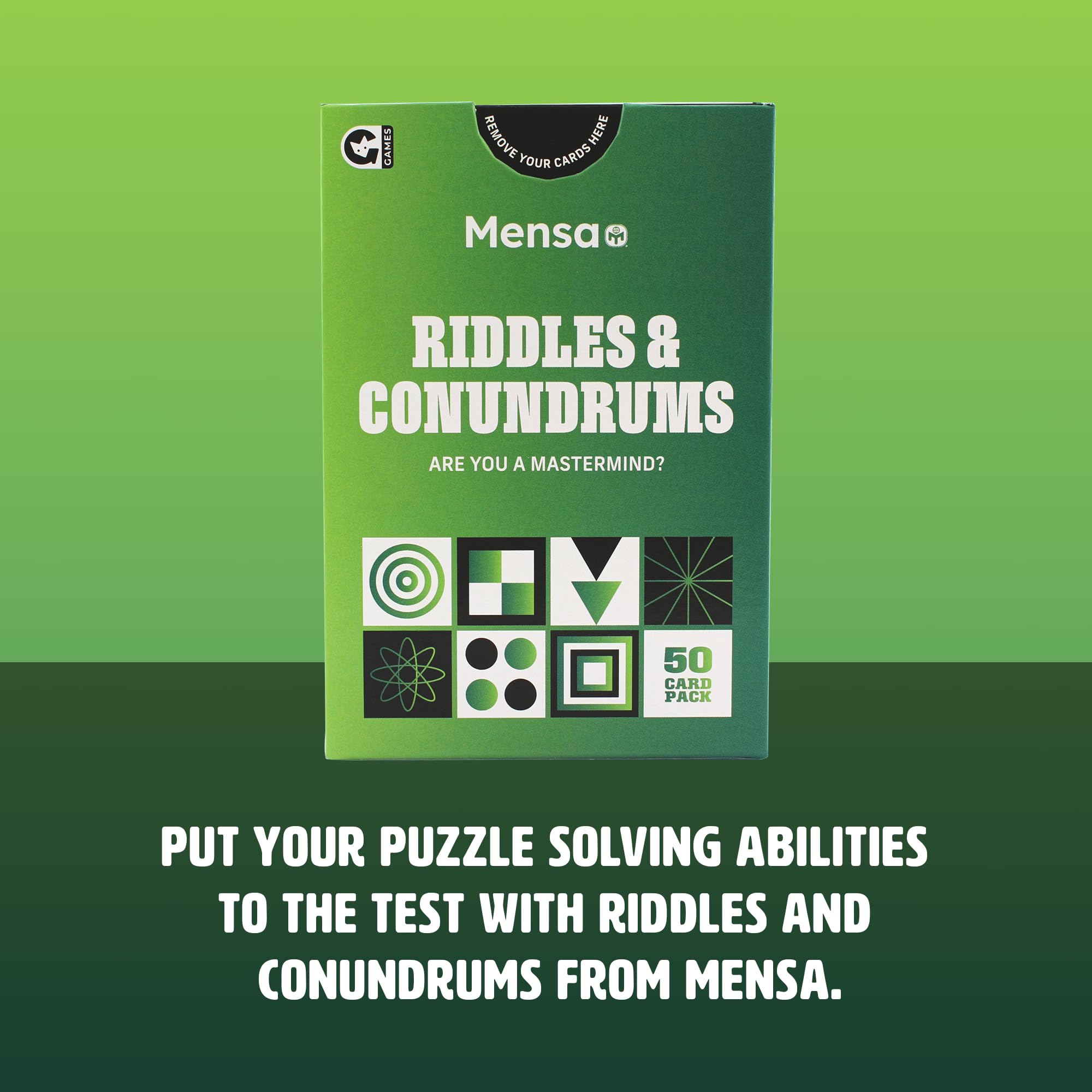 - Enjoy Puzzles and Conundrums – Whether you want to learn more or just want to have fun, this Mensa card game is for you. Each riddle game card box pack contains 50 game cards featuring visual, logic and number puzzles.