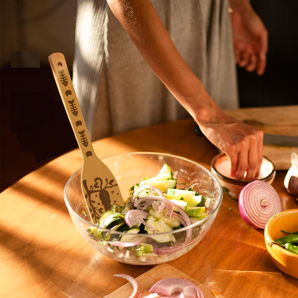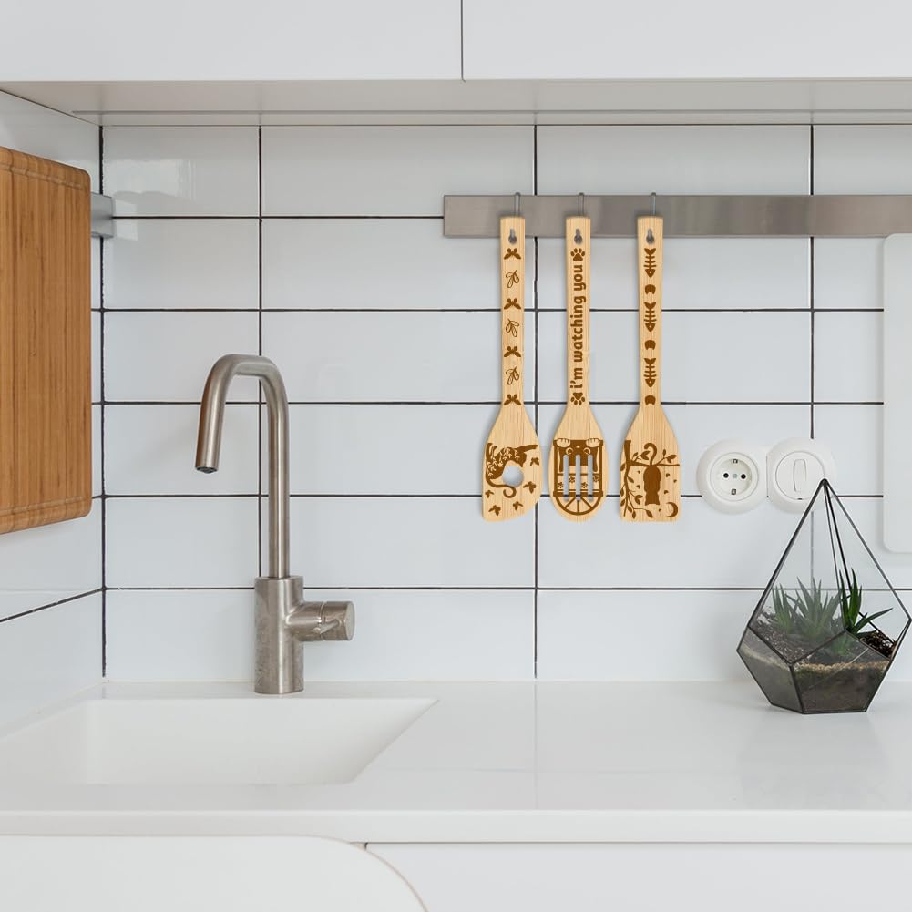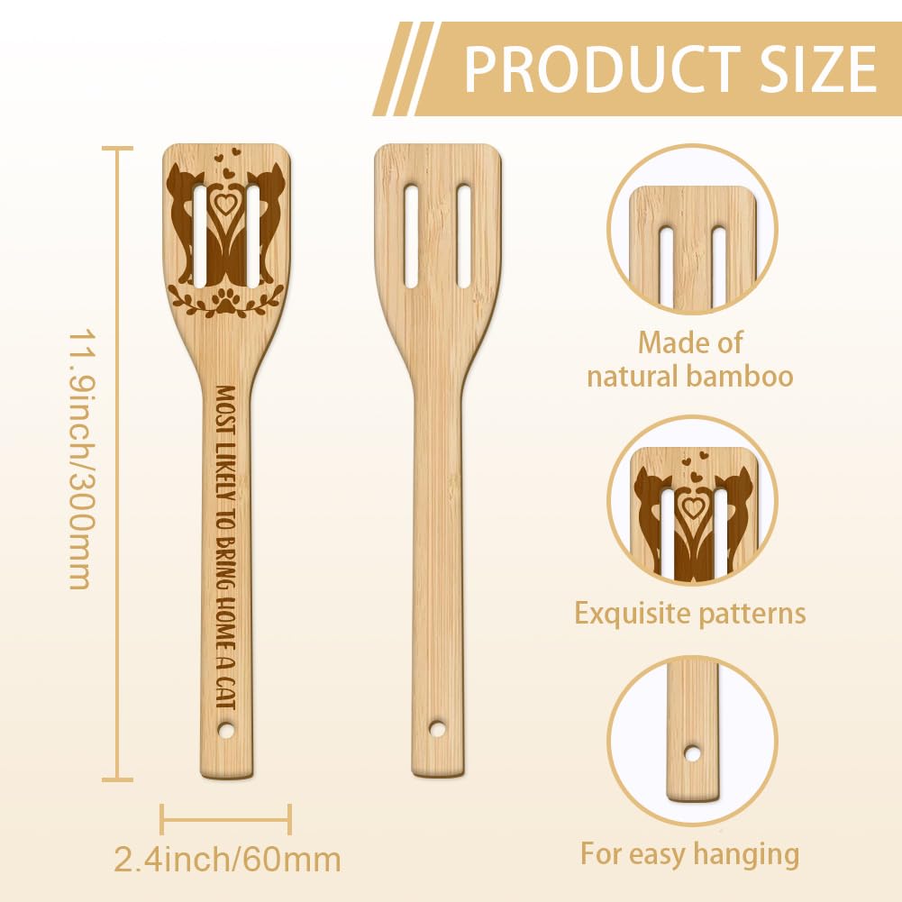 - Cat Engraved Kitchen Cooking Set: 6Pcs 300x60mm/12×2.5inch cat themed wooden spoons cooking utensils set include slotted spatula, slotted spoon, soup spoon, forked spatula, single hole spatula and spatula, each style 1pcs. Which is a good helper for you to cook delicious food!
