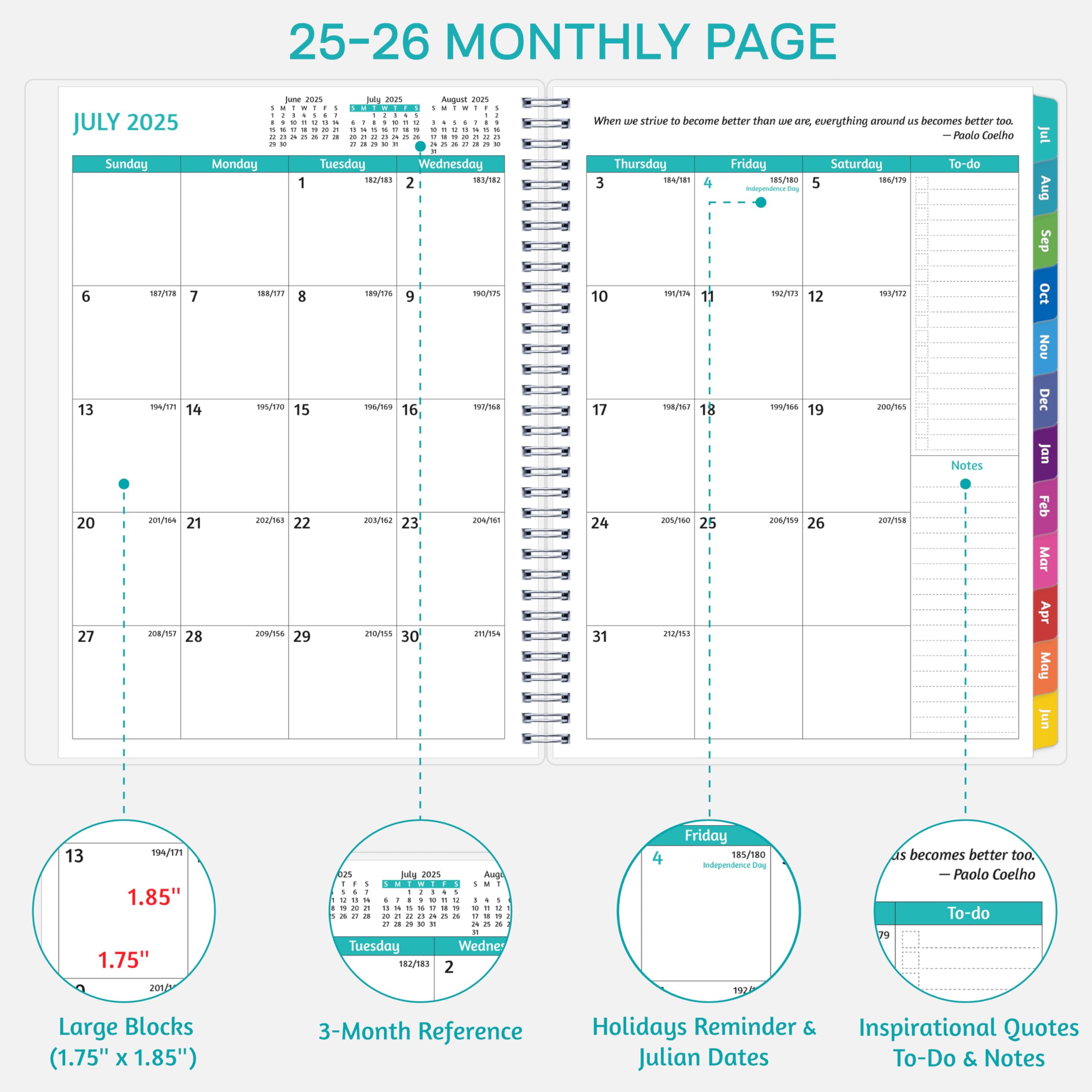 - EXTRA MONTHLY VIEWS: With inspirational quotes, 2-page monthly spread gives you a clear view of your plans for the whole month. There are 3 reference calendars to review the past and plan for the future, To-do lists and Notes for important reminders, and Holidays are also marked, Large Blocks to jot down your plans, ideas, activities, appointments, etc.