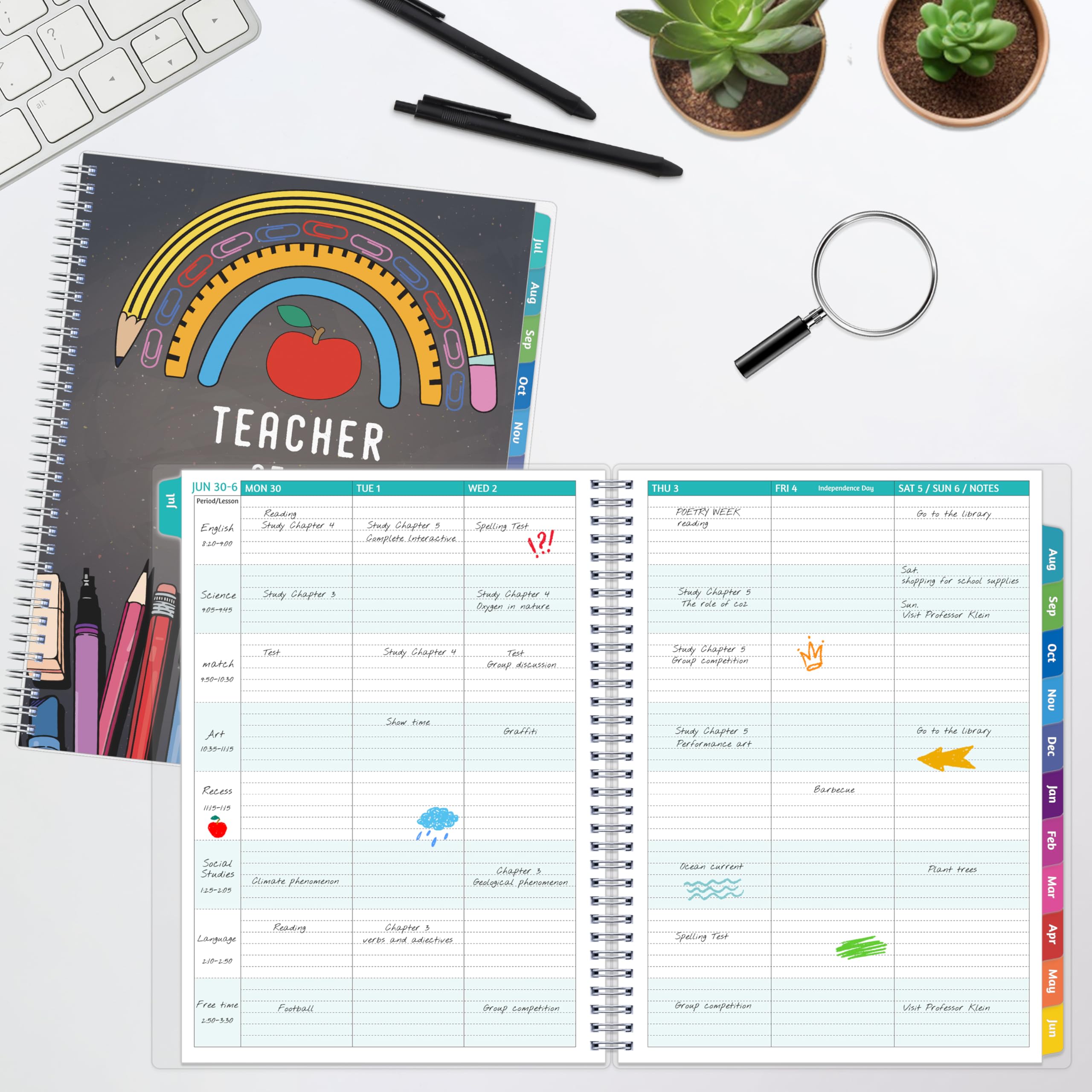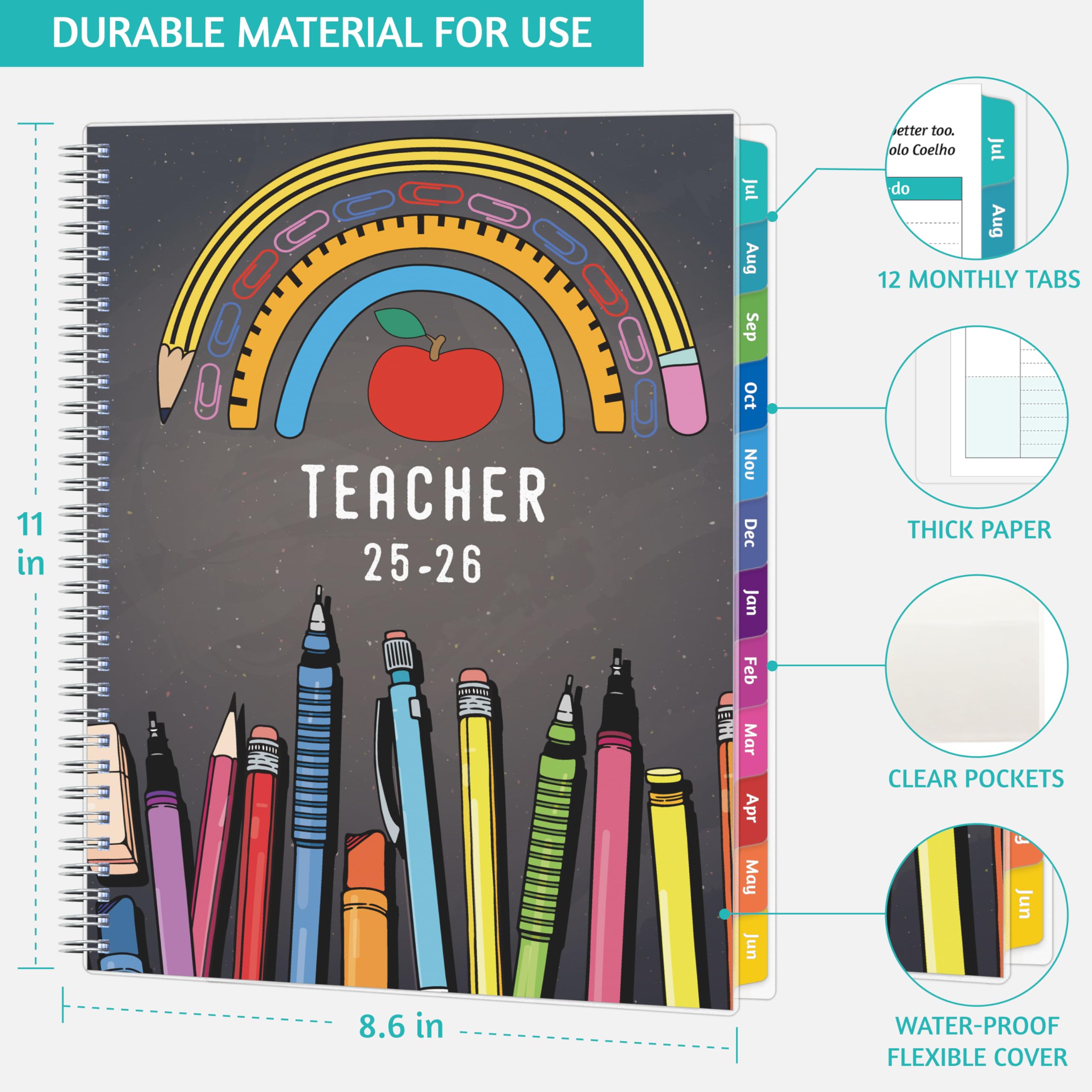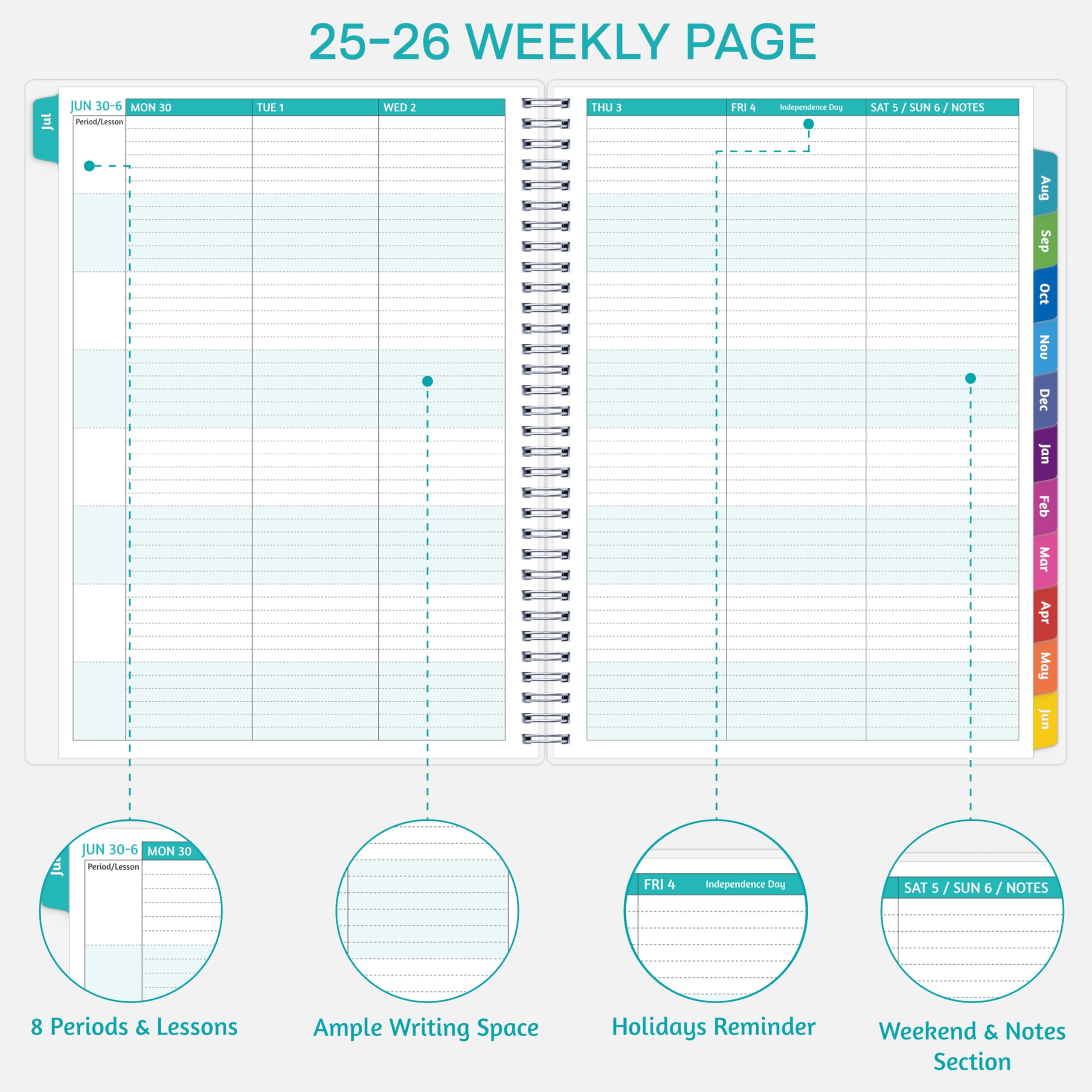 - TEACHER PLANNER 2025-2026: The teacher planner with 8 lessons is from July 2025 – June 2026, covering 12 months of monthly and weekly spread for an easy academic year planning. SIZE: 8.6” x 11”, moderate size, easy to carry and durable to use.