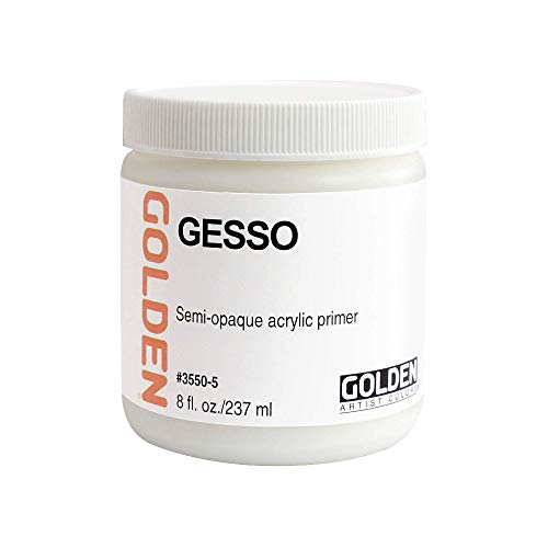 Golden Artist Color Gesso 3550-5 with Sticky Notes Gesso can be thought of as the bridge between your support (canvas, board or whatever you paint on) and the paint. GOLDEN Gesso is designed to penetrate supports and provide a surface to which paint can adhere. Proper preparation with GOLDEN Gesso increases the life span of artwork. Our Gesso is formulated to be flexible and is highly pigmented for greater opacity. White and Black Gesso are ready-to-use formulations for painting on most surfaces. They are flexible and can be applied in thin layers to conform to a variey to textures without cracking. For oil painting, we recommended that at least three layers of gesso. Gesso can be mixed with acrylic colors to produce a range of colored grounds. (Item# White Gesso – 3550, Black Gesso – 3560)