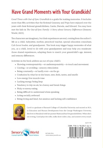If you have an out-of-sync grandchild and are looking for enjoyable interactions, this book is for you. It is part of the Out-of-Sync Series, intended to help parents, teachers, relatives, and professionals support kids with sensory processing differences. Gold Award Recipient, Mom’s Choice Awards! Good Times with Out-of-Sync Grandkids is a guide for making memories. It includes more than fifty activities that the fictional Grammy and Pops have enjoyed over the years with their fictional grandchildren, Carrie, Darwin, and Edward. You may have met the kids in The Out-of-Sync Family: A Story about Sensory Differences (Sensory World, 2023). The characters are imaginary, but their experiences are real, coming from the author’s life as a child, babysitter, mother, preschool teacher, special education consultant, Cub Scout leader, and grandparent. This book may trigger happy memories of what you, as a child, loved to do with your grandparents and may help you reanimate those shared experiences, adapting them to match your grandchild’s age, interest, and sensory differences. Activities in the book address: Showing overresponsivity–or underresponsivity–to touch and movement Craving–or avoiding–sensory stimulation Constantly–or hardly ever–on the go Confusion by what he or she hears, sees, feels, tastes, and smells Lacking energy/being limp Tripping on air, being clumsy, breaking things Picky or messy eating Being difficult to understand when speaking Acting socially awkward Being loving and kind, but anxious and lacking self-confidence