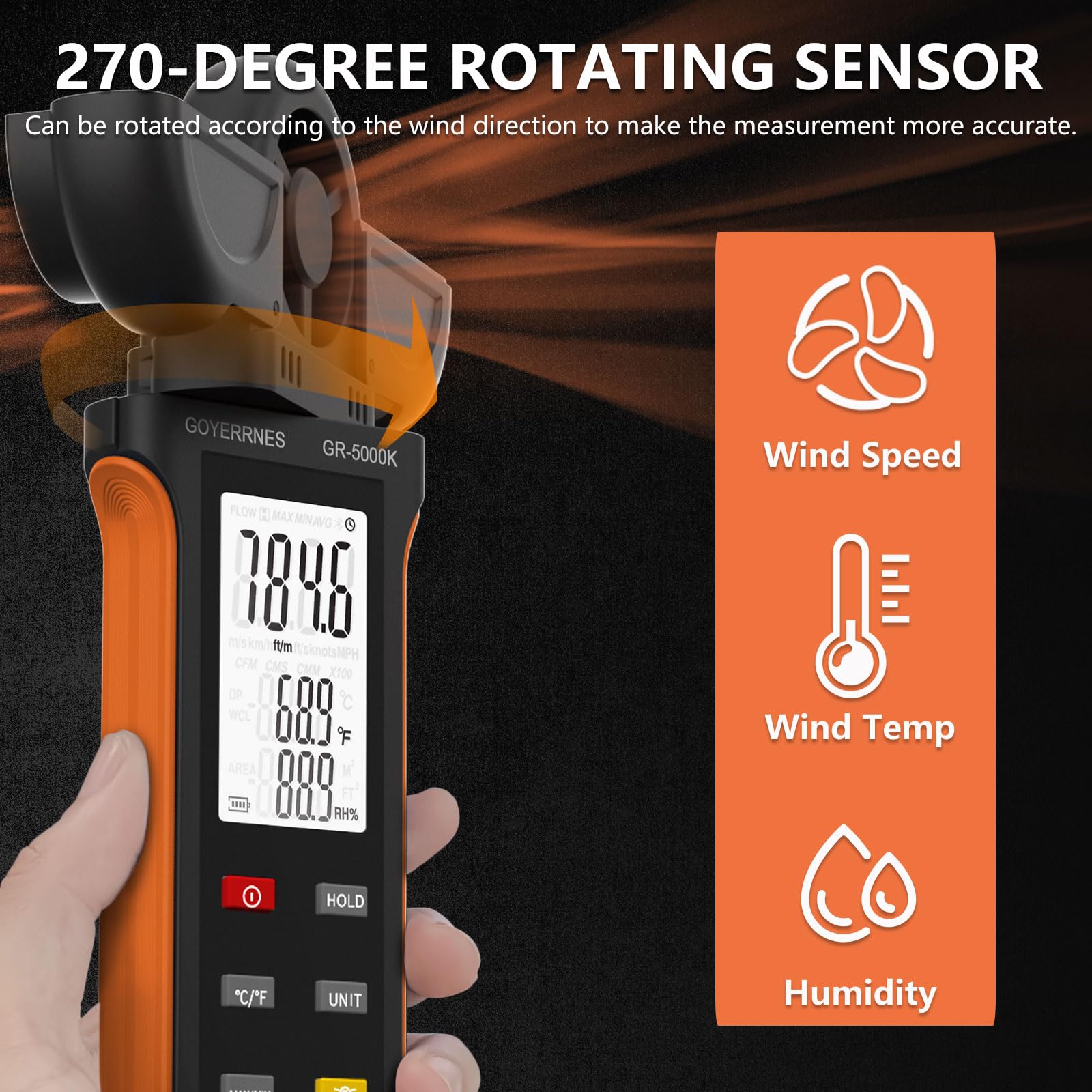 - Flexible head & Vane Protection – This handheld anemometer features a 270-degree rotating wind sensor that allows it to better capture wind from multiple directions for more accurate measurements. The vane cover not only adds a sleek and modern aesthetic to the anemometer, but also protects the fan blades from damage.
