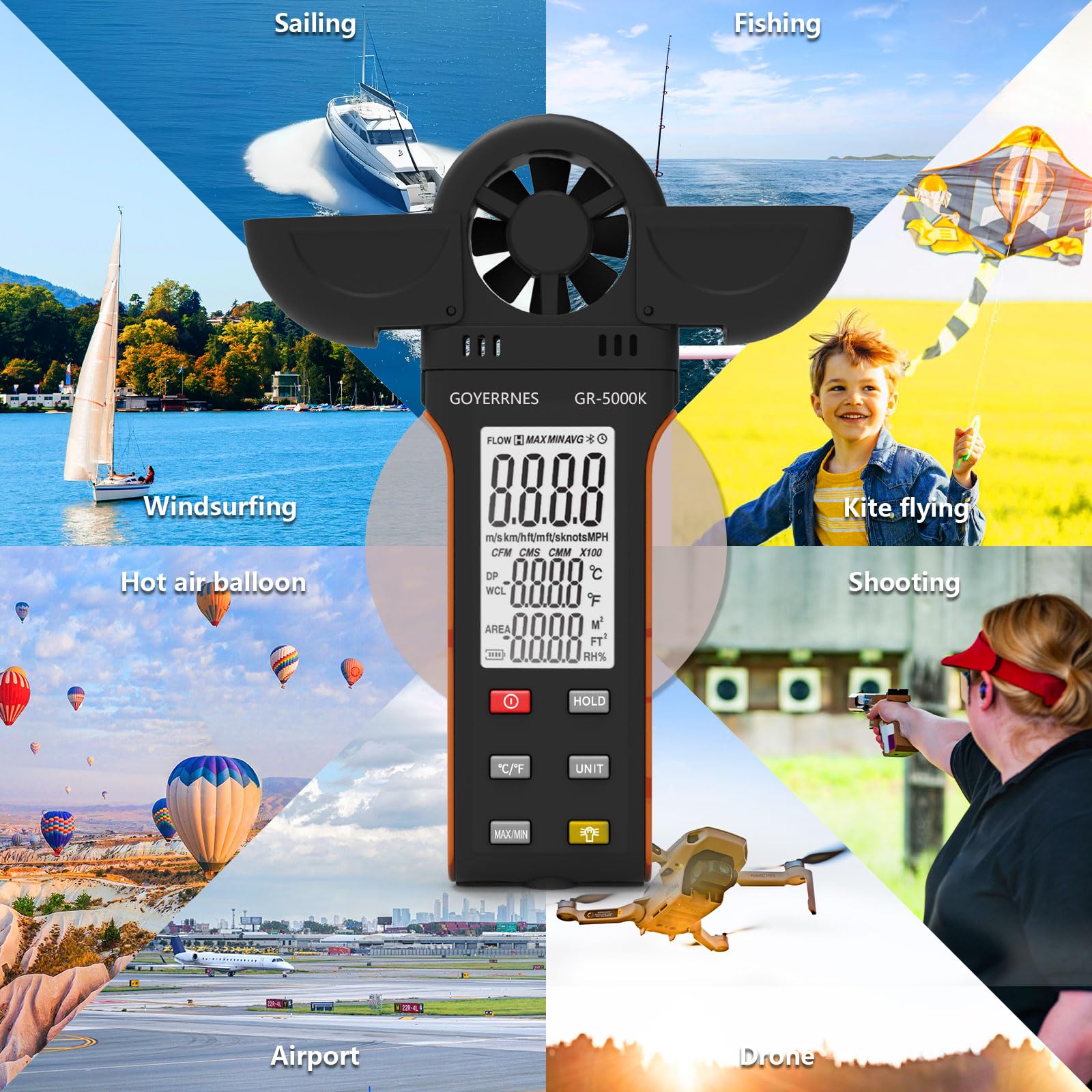 - Highly Accurate Wind Meter- Thanks to the sensitive dual temp sensors, 8 vanes, smooth fan shaft, our digital anemometer can accurately detect wind speed((Accuracy:2.0%+1MPH), wind chill and temperature. Which can help you monitor wind conditions in real time and calculate the CFM.(Air Flow in CFM = Wind speed x Duct Cross Sectional Area)