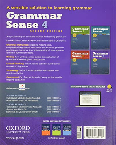 Grammar Sense is a four-level discourse-based grammar series which focuses on the connection between form, meaning, and use of English structures. The series is based on the fundamental premise that English grammar is learnable and teachable if it is systematically organized and explained. Grammar Sense implements linguistic and applied linguistic research on how, where, when, and why native speakers use English structures, and how non-native speakers learn them. This series provides learners with a true understanding of how grammar is used in authentic contexts. Grammar is presented in discourse rather than in isolated sentences which allows the students to understand English grammar in real life situations.
